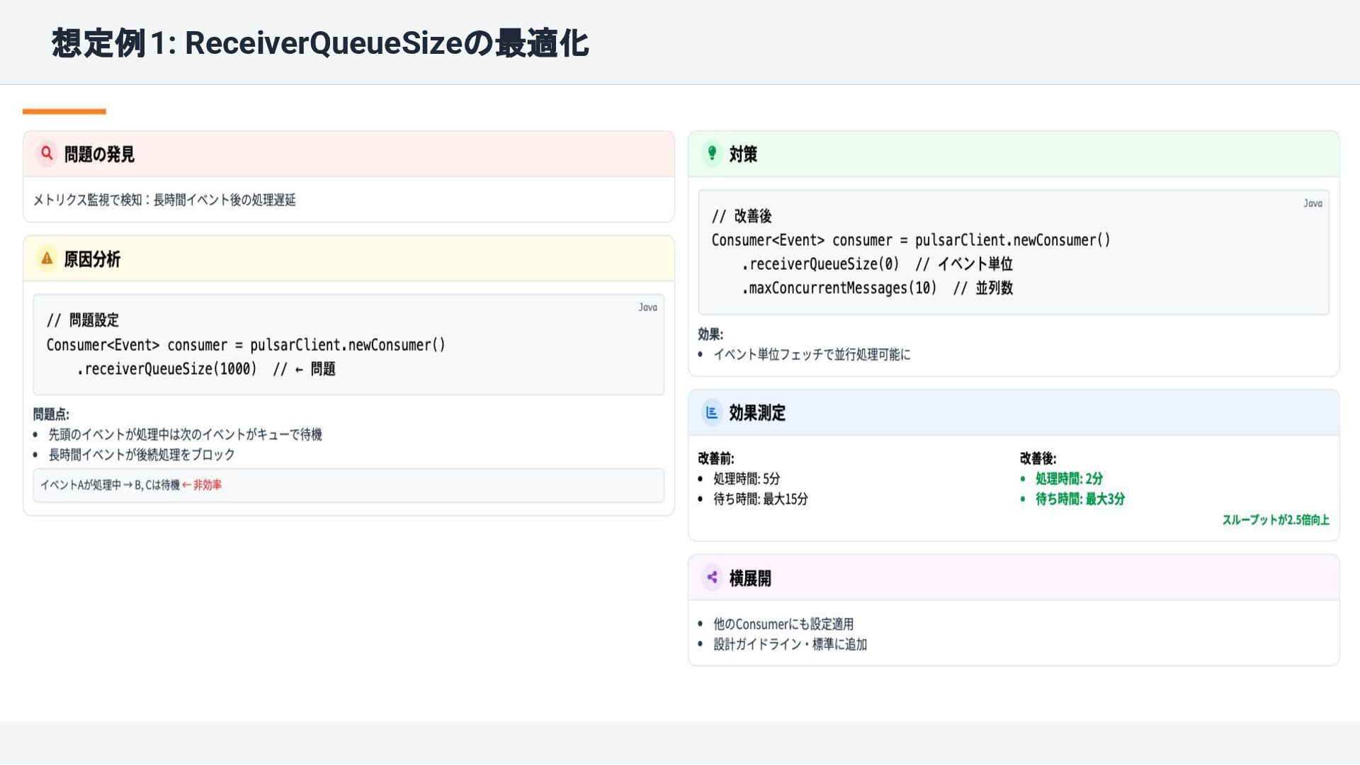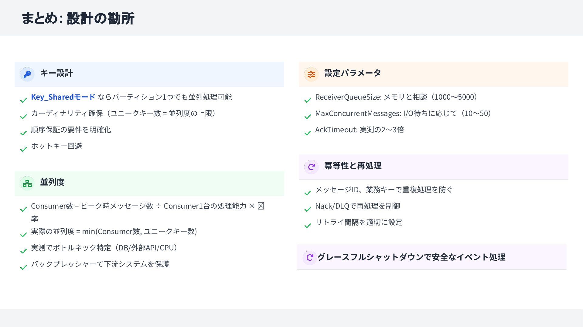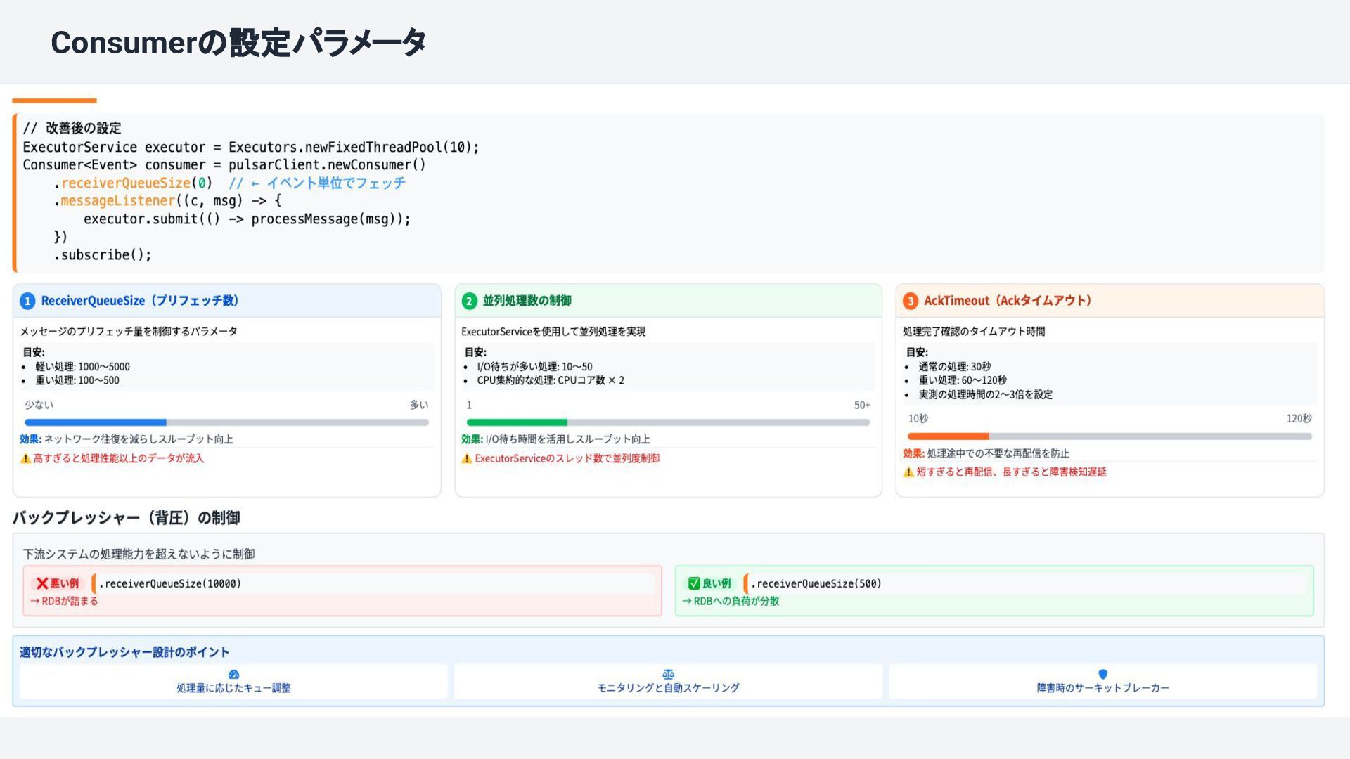 並列度 Consumer数 = ピーク時メッセージ数 ÷ Consumer1台の処理能⼒ × 余裕 率 実際の並列度 = min(Consumer数, ユニークキー数) 実測でボトルネック特定(DB/外部API/CPU) バックプレッシャーで下流システムを保護 設定パラメータ ReceiverQueueSize: メモリと相談(1000〜5000) MaxConcurrentMessages: I/O待ちに応じて(10〜50) AckTimeout: 実測の2〜3倍 冪等性と再処理 メッセージID、業務キーで重複処理を防ぐ Nack/DLQで再処理を制御 リトライ間隔を適切に設定 グレースフルシャットダウンで安全なイベント処理