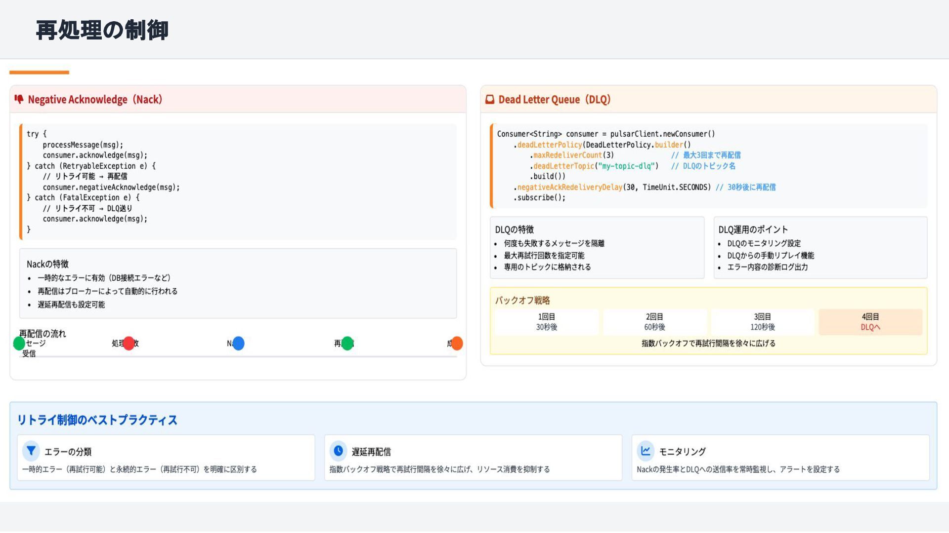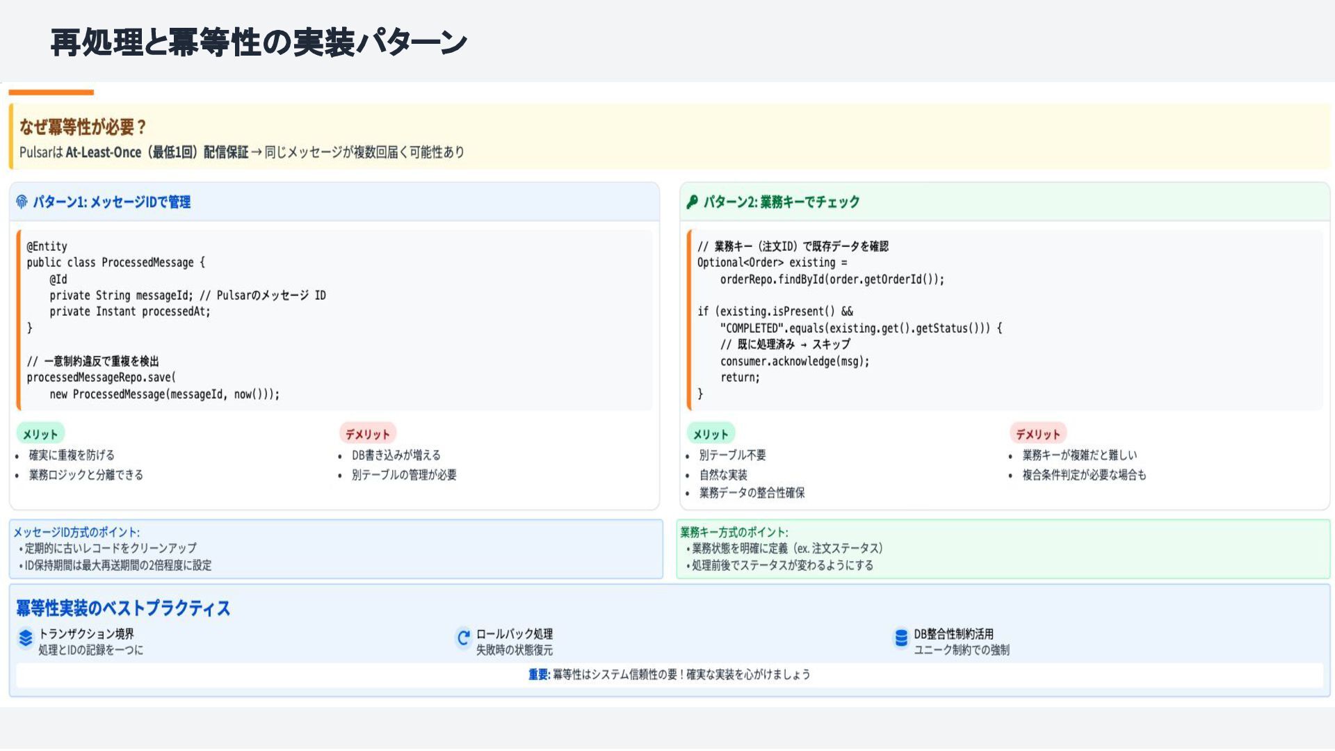 class ProcessedMessage { @Id private String messageId; // Pulsarのメッセージ ID private Instant processedAt; } // 一意制約違反で重複を検出 processedMessageRepo.save( new ProcessedMessage(messageId, now())); メリット • 確実に重複を防げる • 業務ロジックと分離できる デメリット • DB書き込みが増える • 別テーブルの管理が必要 パターン2: 業務キーでチェック // 業務キー(注文ID)で既存データを確認 Optional<Order> existing = orderRepo.findById(order.getOrderId()); if (existing.isPresent() && "COMPLETED".equals(existing.get().getStatus())) { // 既に処理済み → スキップ consumer.acknowledge(msg); return; } メリット • 別テーブル不要 • ⾃然な実装 • 業務データの整合性確保 デメリット • 業務キーが複雑だと難しい • 複合条件判定が必要な場合も メッセージID⽅式のポイント: • • 定期的に古いレコードをクリーンアップ • • ID保持期間は最⼤再送期間の2倍程度に設定 業務キー⽅式のポイント: • • 業務状態を明確に定義(ex. 注⽂ステータス) • • 処理前後でステータスが変わるようにする 冪等性実装のベストプラクティス トランザクション境界 処理とIDの記録を⼀つに ロールバック処理 失敗時の状態復元 DB整合性制約活⽤ ユニーク制約での強制 重要: 冪等性はシステム信頼性の要!確実な実装を⼼がけましょう