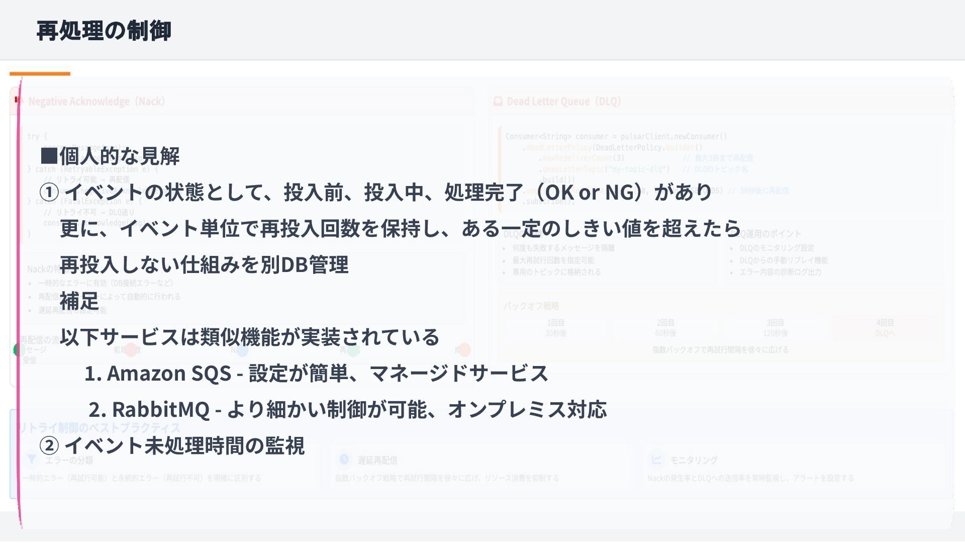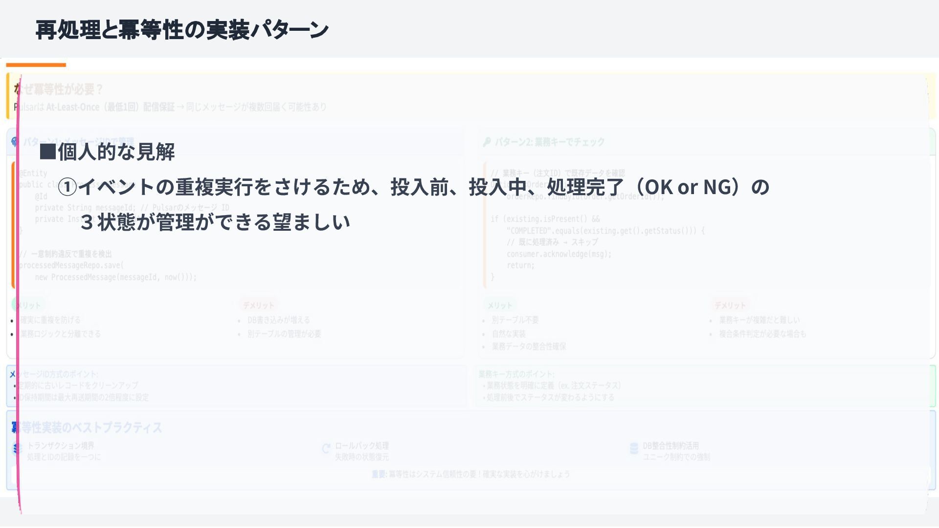 class ProcessedMessage { @Id private String messageId; // Pulsarのメッセージ ID private Instant processedAt; } // 一意制約違反で重複を検出 processedMessageRepo.save( new ProcessedMessage(messageId, now())); メリット • 確実に重複を防げる • 業務ロジックと分離できる デメリット • DB書き込みが増える • 別テーブルの管理が必要 パターン2: 業務キーでチェック // 業務キー(注文ID)で既存データを確認 Optional<Order> existing = orderRepo.findById(order.getOrderId()); if (existing.isPresent() && "COMPLETED".equals(existing.get().getStatus())) { // 既に処理済み → スキップ consumer.acknowledge(msg); return; } メリット • 別テーブル不要 • ⾃然な実装 • 業務データの整合性確保 デメリット • 業務キーが複雑だと難しい • 複合条件判定が必要な場合も メッセージID⽅式のポイント: • • 定期的に古いレコードをクリーンアップ • • ID保持期間は最⼤再送期間の2倍程度に設定 業務キー⽅式のポイント: • • 業務状態を明確に定義(ex. 注⽂ステータス) • • 処理前後でステータスが変わるようにする 冪等性実装のベストプラクティス トランザクション境界 処理とIDの記録を⼀つに ロールバック処理 失敗時の状態復元 DB整合性制約活⽤ ユニーク制約での強制 重要: 冪等性はシステム信頼性の要!確実な実装を⼼がけましょう ▪個⼈的な⾒解  ①イベントの重複実⾏をさけるため、投⼊前、投⼊中、処理完了(OK or NG)の   3状態が管理ができる望ましい