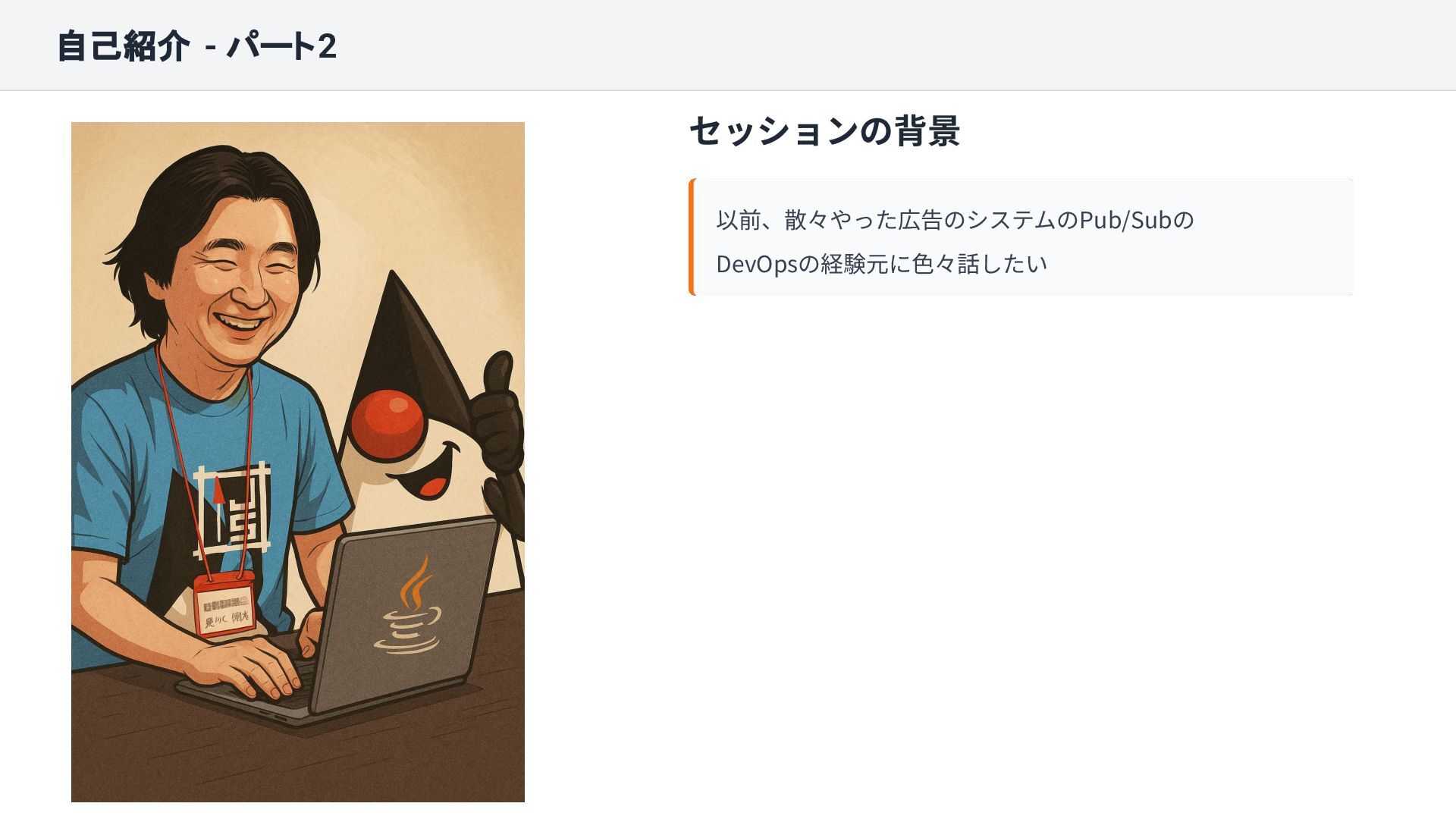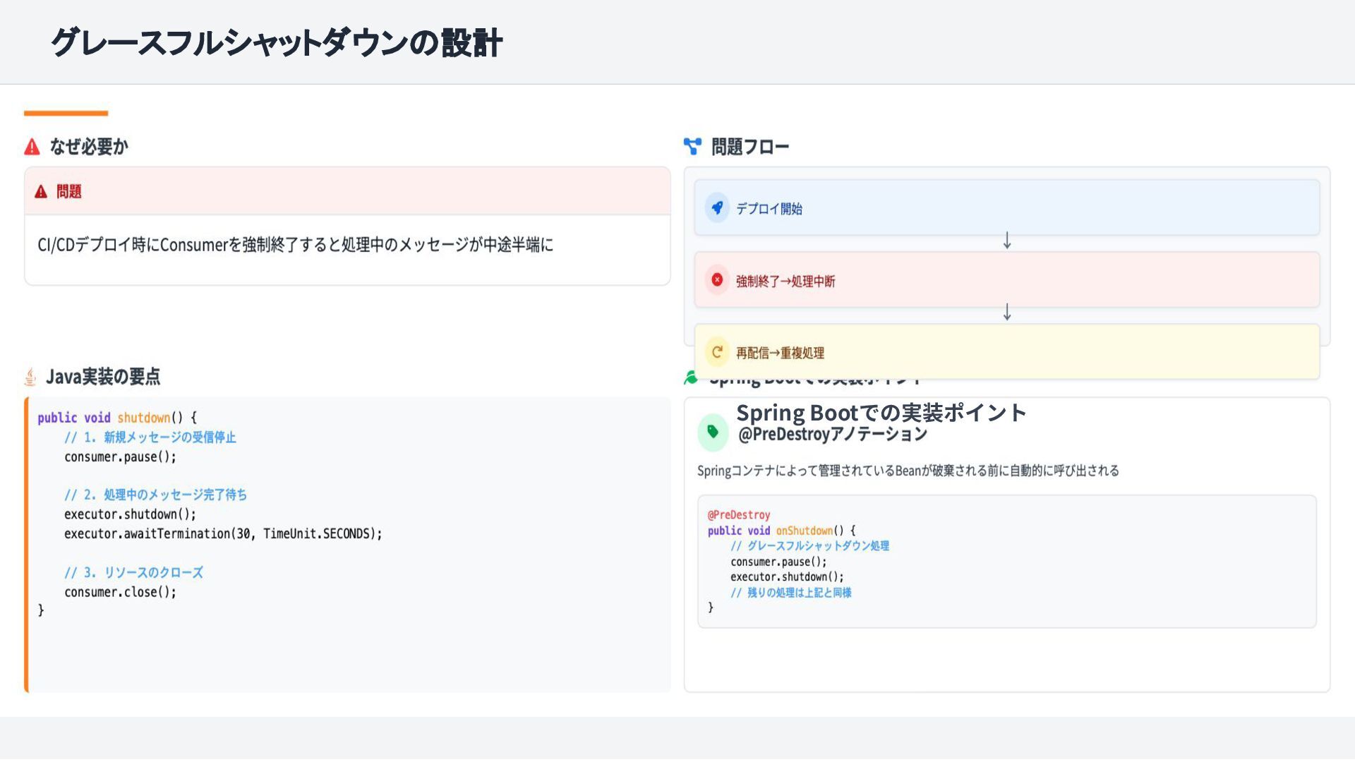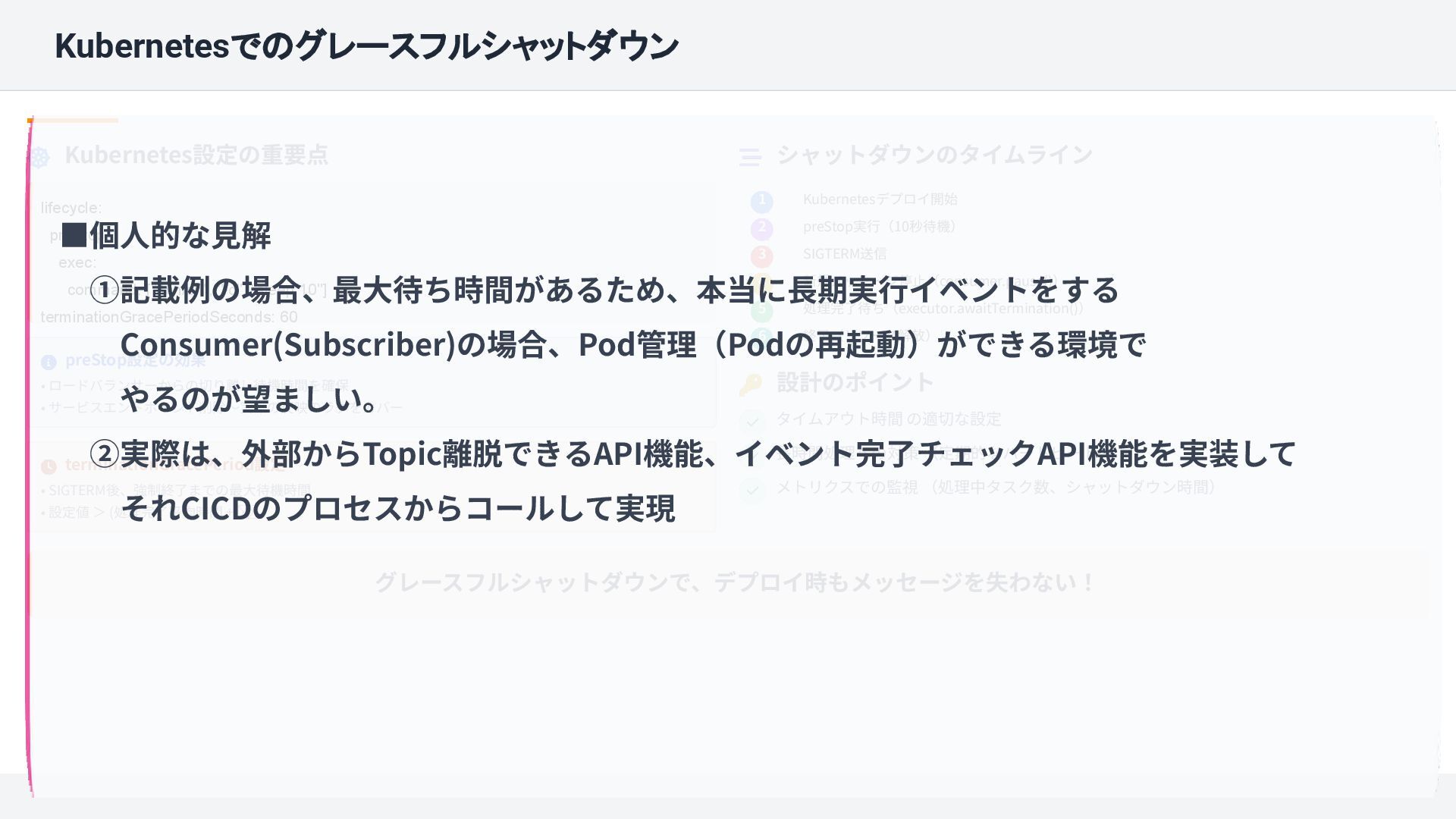 terminationGracePeriodSeconds: 60 preStop設定の効果 • ロードバランサーからの切り離し待機時間を確保 • サービスエンドポイント削除〜実際の反映のラグをカバー terminationGracePeriod設定 • SIGTERM後、強制終了までの最⼤待機時間 • 設定値 > (処理完了平均時間 + 余裕) を確保 シャットダウンのタイムライン 1 Kubernetesデプロイ開始 2 preStop実⾏(10秒待機) 3 SIGTERM送信 4 新規メッセージ停⽌(consumer.pause()) 5 処理完了待ち(executor.awaitTermination()) 6 終了(リソース解放) 設計のポイント タイムアウト時間 の適切な設定 ⻑時間処理への対策 (定期的なハートビート) メトリクスでの監視 (処理中タスク数、シャットダウン時間) グレースフルシャットダウンで、デプロイ時もメッセージを失わない! ▪個⼈的な⾒解  ①記載例の場合、最⼤待ち時間があるため、本当に⻑期実⾏イベントをする   Consumer(Subscriber)の場合、Pod管理(Podの再起動)ができる環境で   やるのが望ましい。  ②実際は、外部からTopic離脱できるAPI機能、イベント完了チェックAPI機能を実装して   それCICDのプロセスからコールして実現