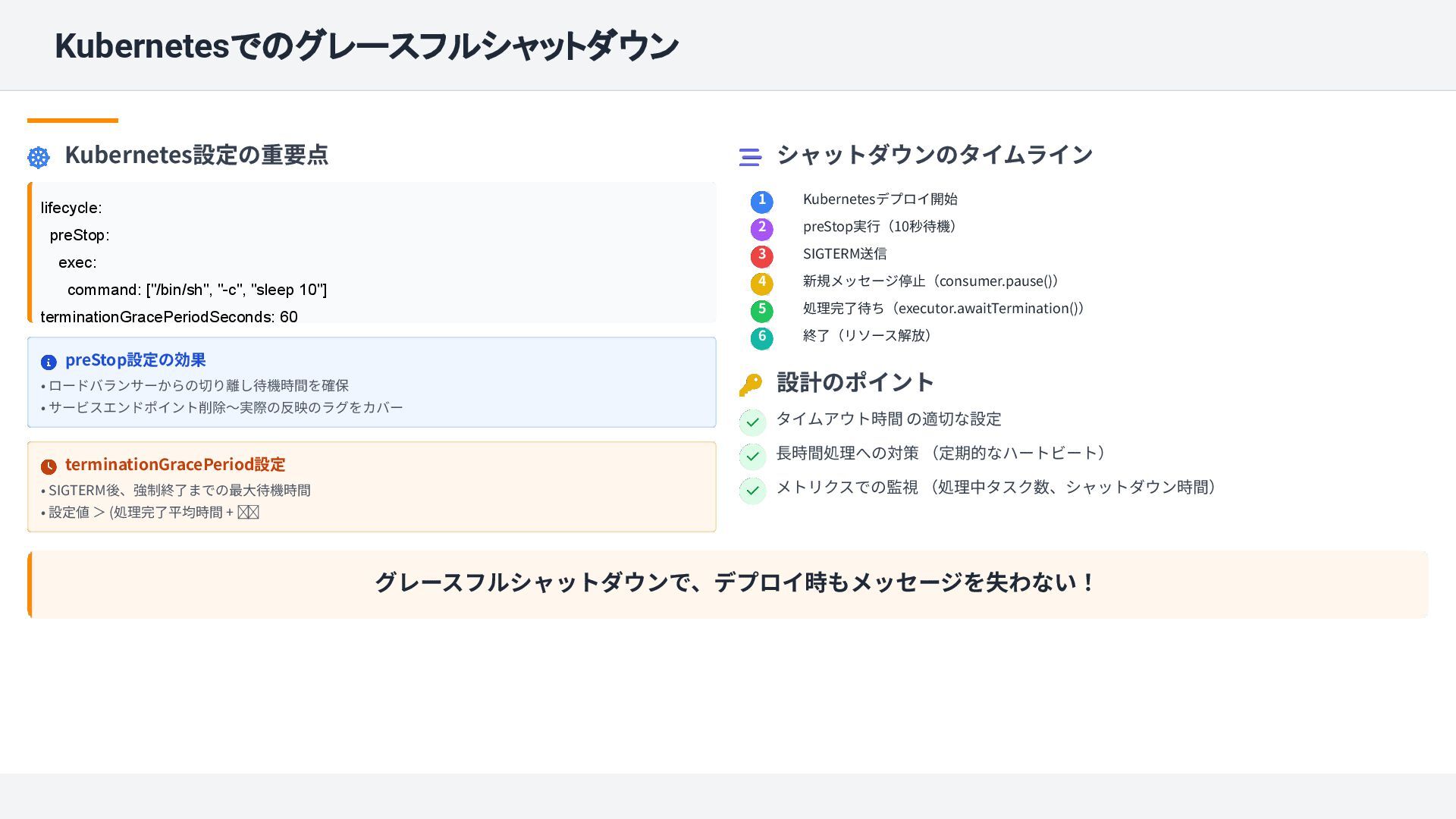 terminationGracePeriodSeconds: 60 preStop設定の効果 • ロードバランサーからの切り離し待機時間を確保 • サービスエンドポイント削除〜実際の反映のラグをカバー terminationGracePeriod設定 • SIGTERM後、強制終了までの最⼤待機時間 • 設定値 > (処理完了平均時間 + 余裕) を確保 シャットダウンのタイムライン 1 Kubernetesデプロイ開始 2 preStop実⾏(10秒待機) 3 SIGTERM送信 4 新規メッセージ停⽌(consumer.pause()) 5 処理完了待ち(executor.awaitTermination()) 6 終了(リソース解放) 設計のポイント タイムアウト時間 の適切な設定 ⻑時間処理への対策 (定期的なハートビート) メトリクスでの監視 (処理中タスク数、シャットダウン時間) グレースフルシャットダウンで、デプロイ時もメッセージを失わない!