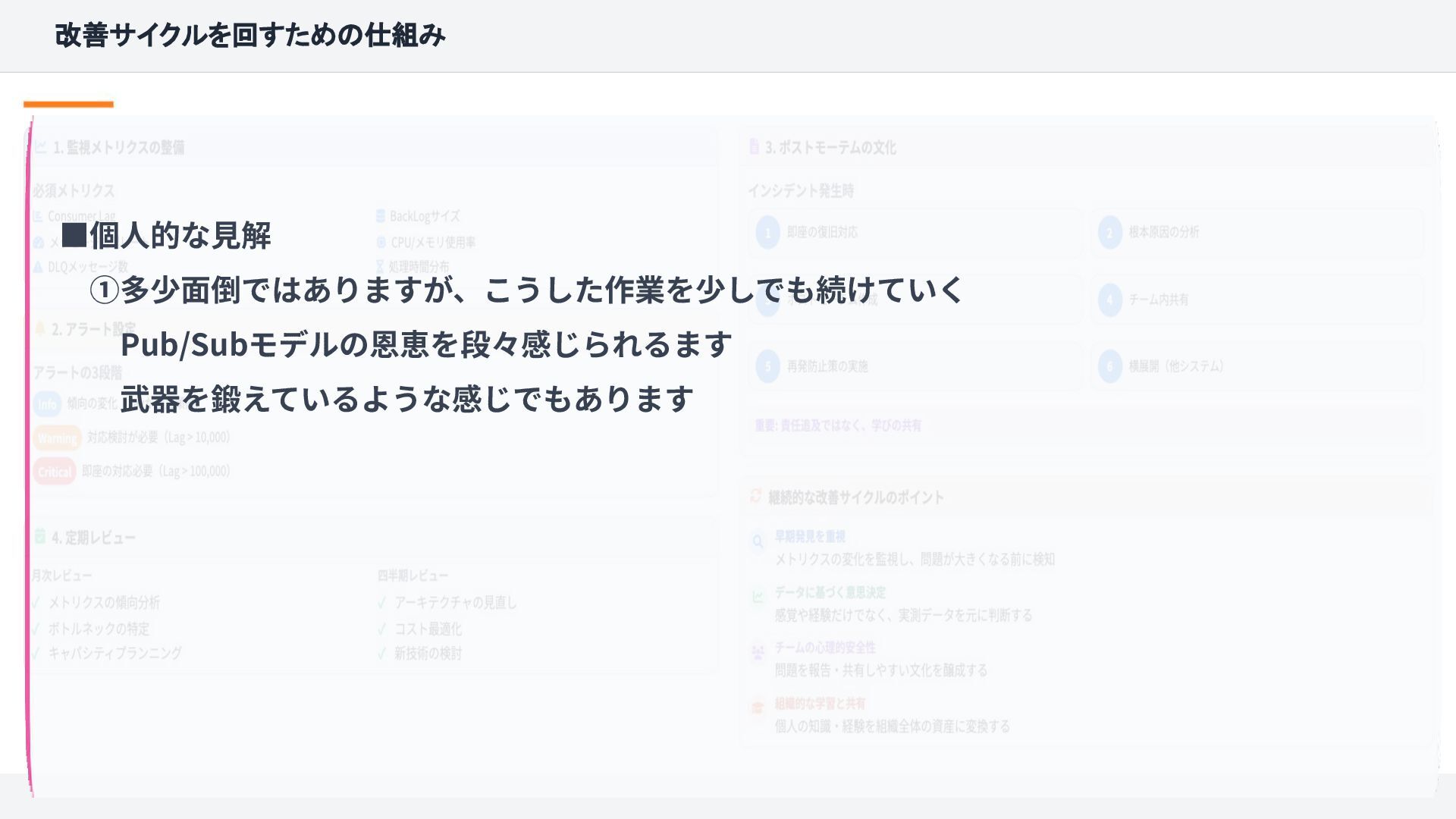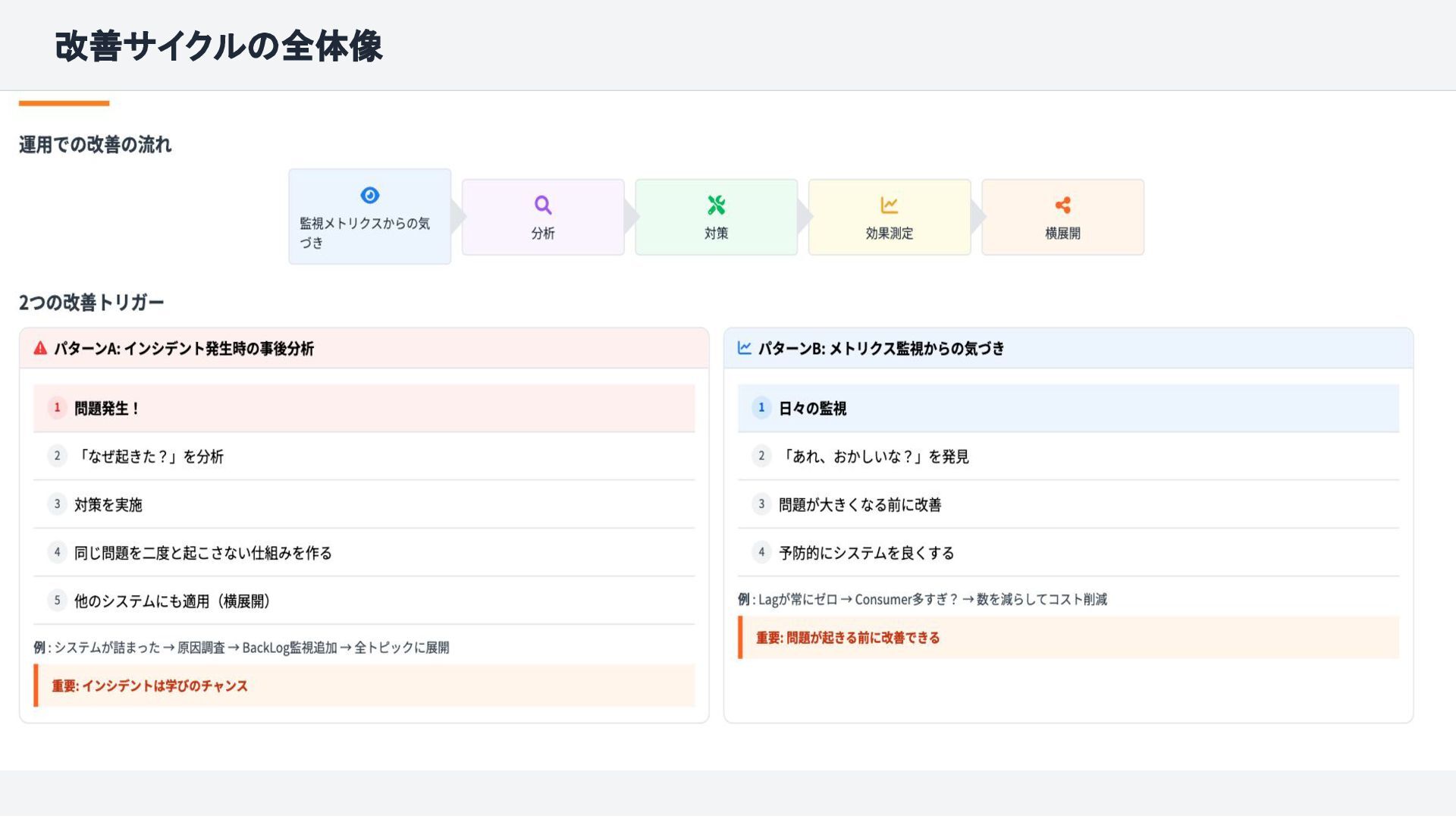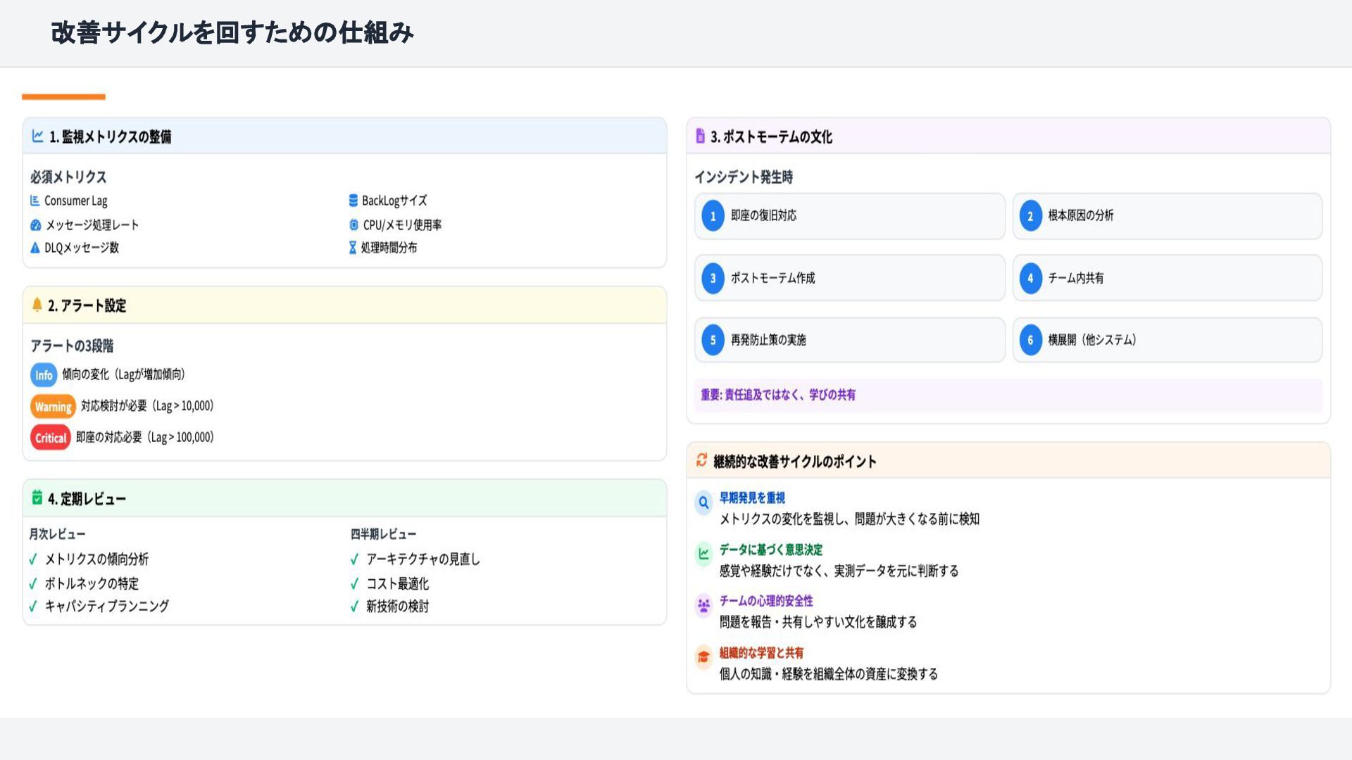 キー設計、並列度、再処理と冪等性など 4. 運⽤の現場で磨いた改善サイクル∕再発防⽌策 監視 → 改善 → 再発防⽌ → 横展開 5. Grafanaによる監視と可視化 相関指標の可視化、ダッシュボード例、メトリクスの選び⽅ 6. まとめ キーポイントの振り返りとクリティカルな話