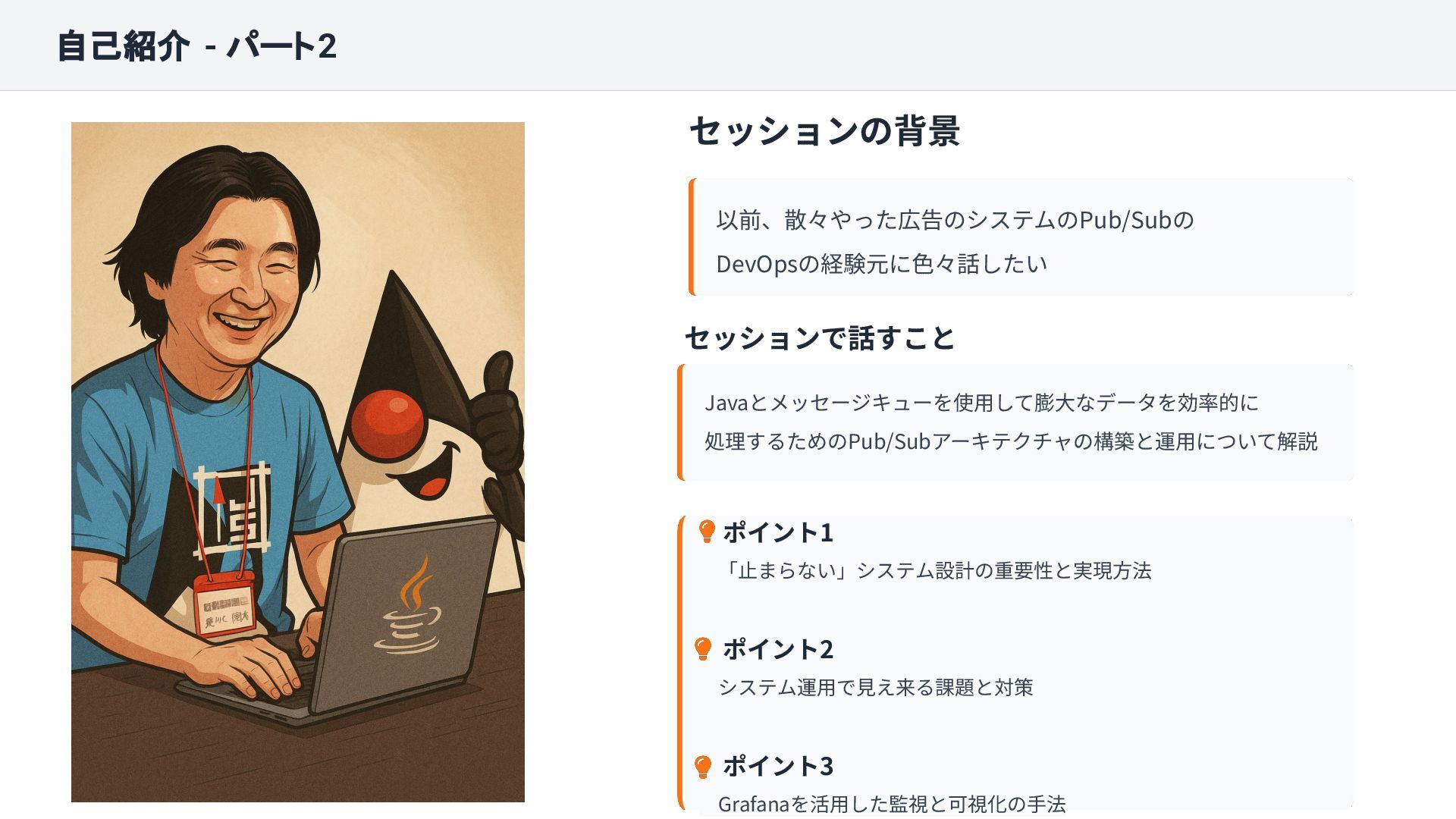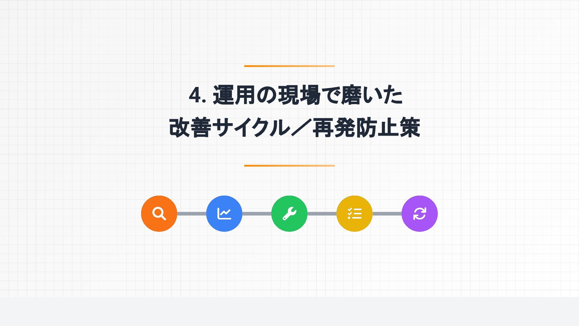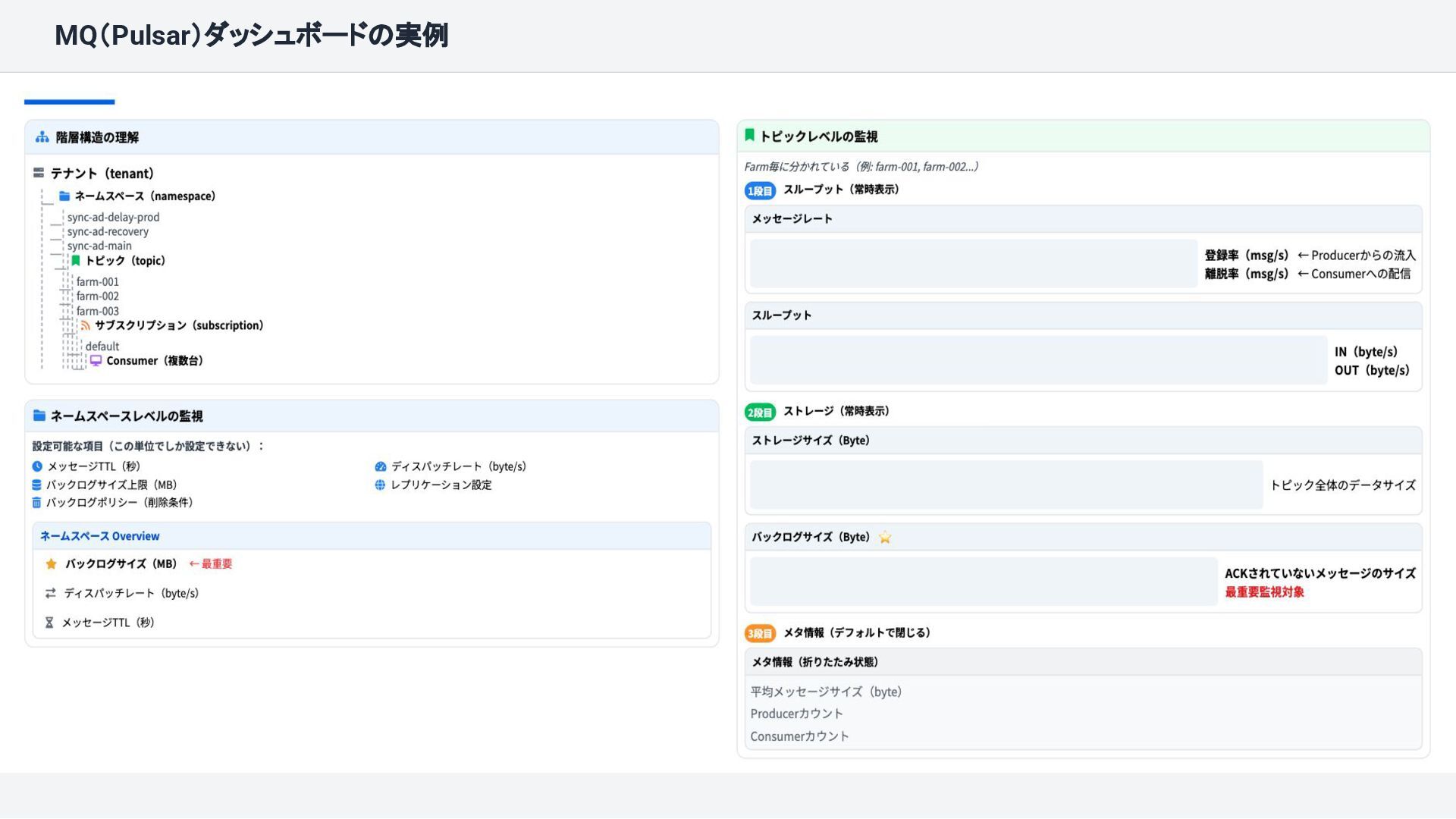 キー設計、並列度、再処理と冪等性など 4. 運⽤の現場で磨いた改善サイクル∕再発防⽌策 監視 → 改善 → 再発防⽌ → 横展開 5. Grafanaによる監視と可視化 相関指標の可視化、ダッシュボード例、メトリクスの選び⽅ 6. まとめ キーポイントの振り返りとクリティカルな話