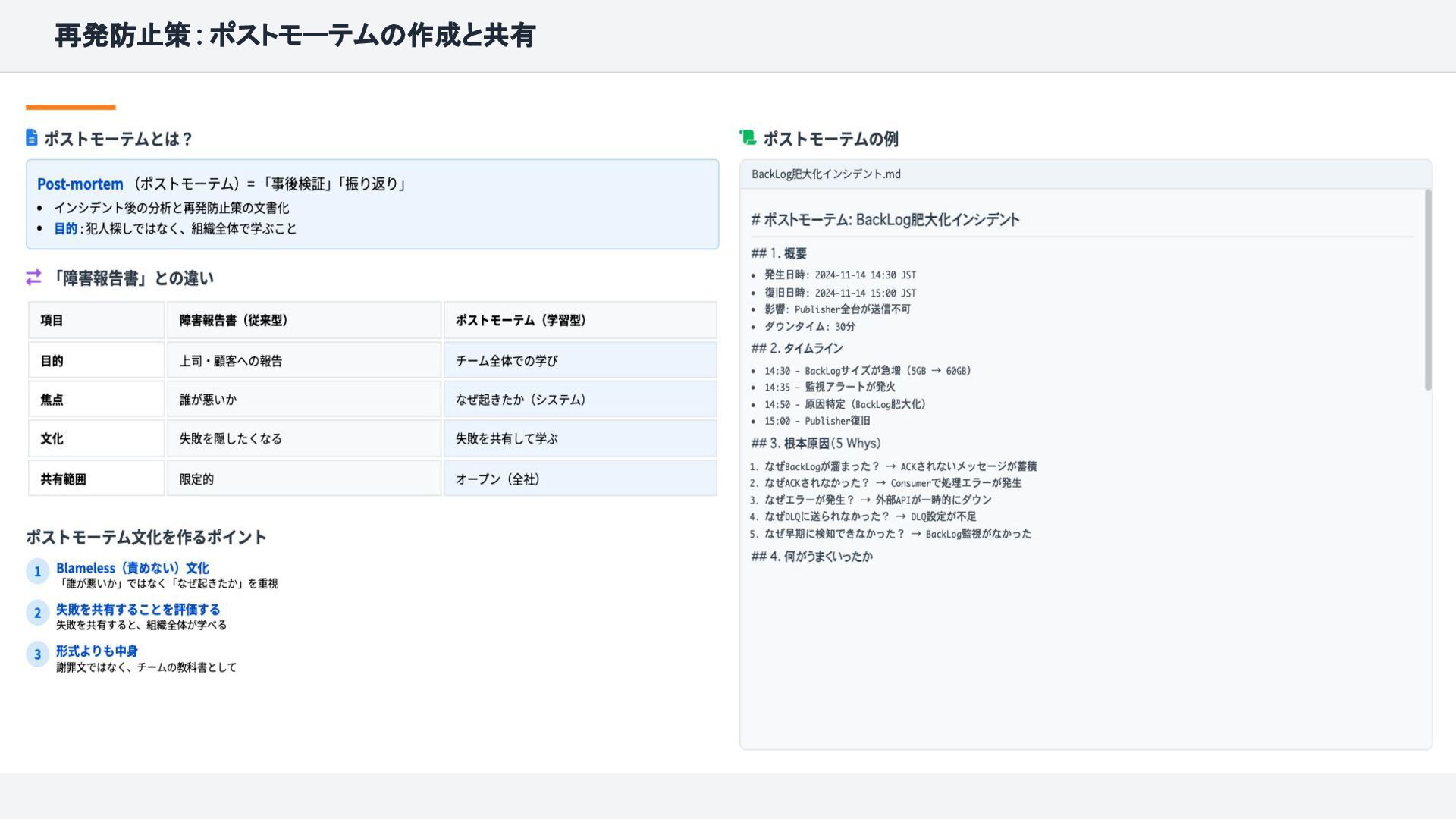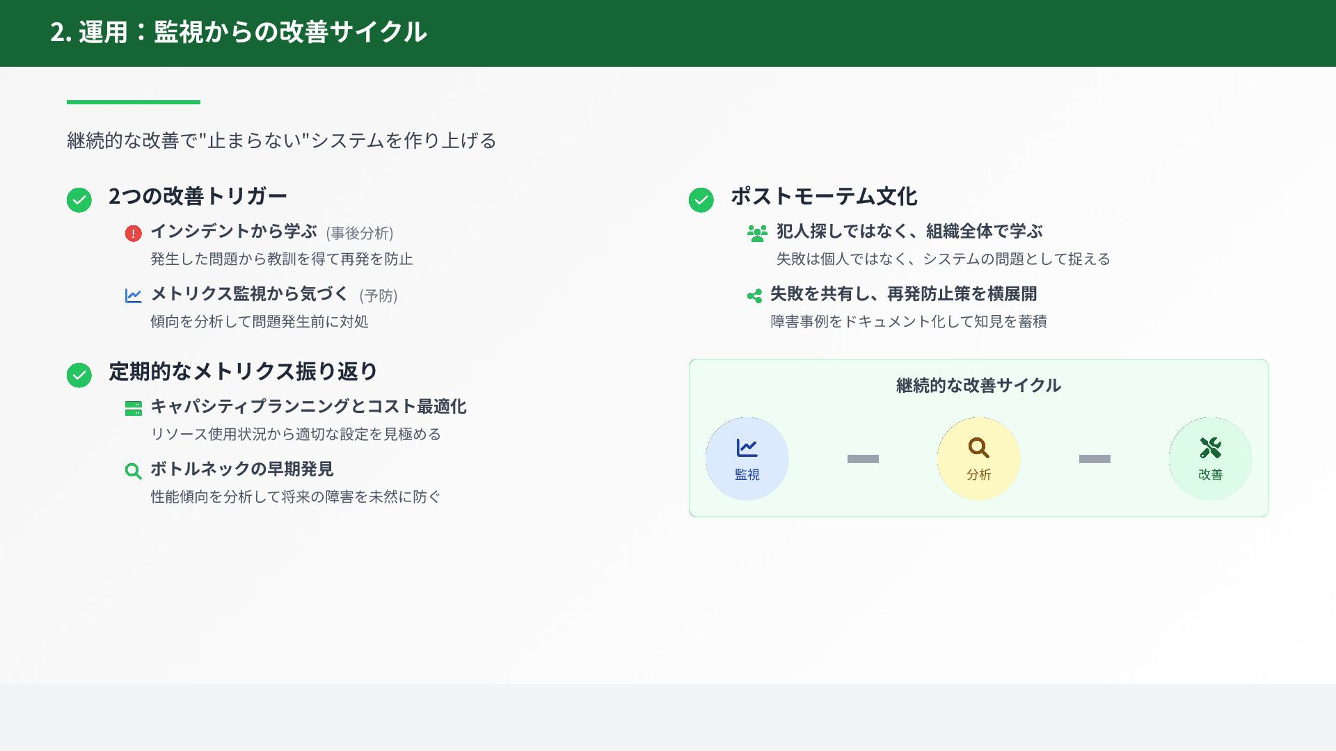 ポストモーテム⽂化 犯⼈探しではなく、組織全体で学ぶ 失敗は個⼈ではなく、システムの問題として捉える 失敗を共有し、再発防⽌策を横展開 障害事例をドキュメント化して知⾒を蓄積 定期的なメトリクス振り返り キャパシティプランニングとコスト最適化 リソース使⽤状況から適切な設定を⾒極める ボトルネックの早期発⾒ 性能傾向を分析して将来の障害を未然に防ぐ 継続的な改善サイクル 監視 分析 改善
