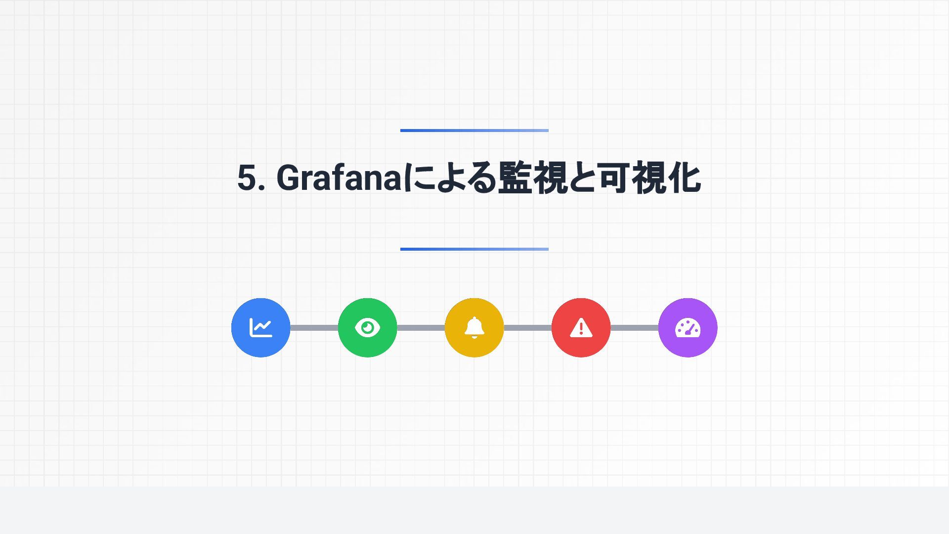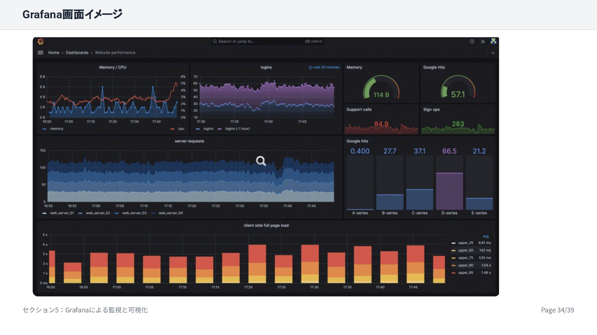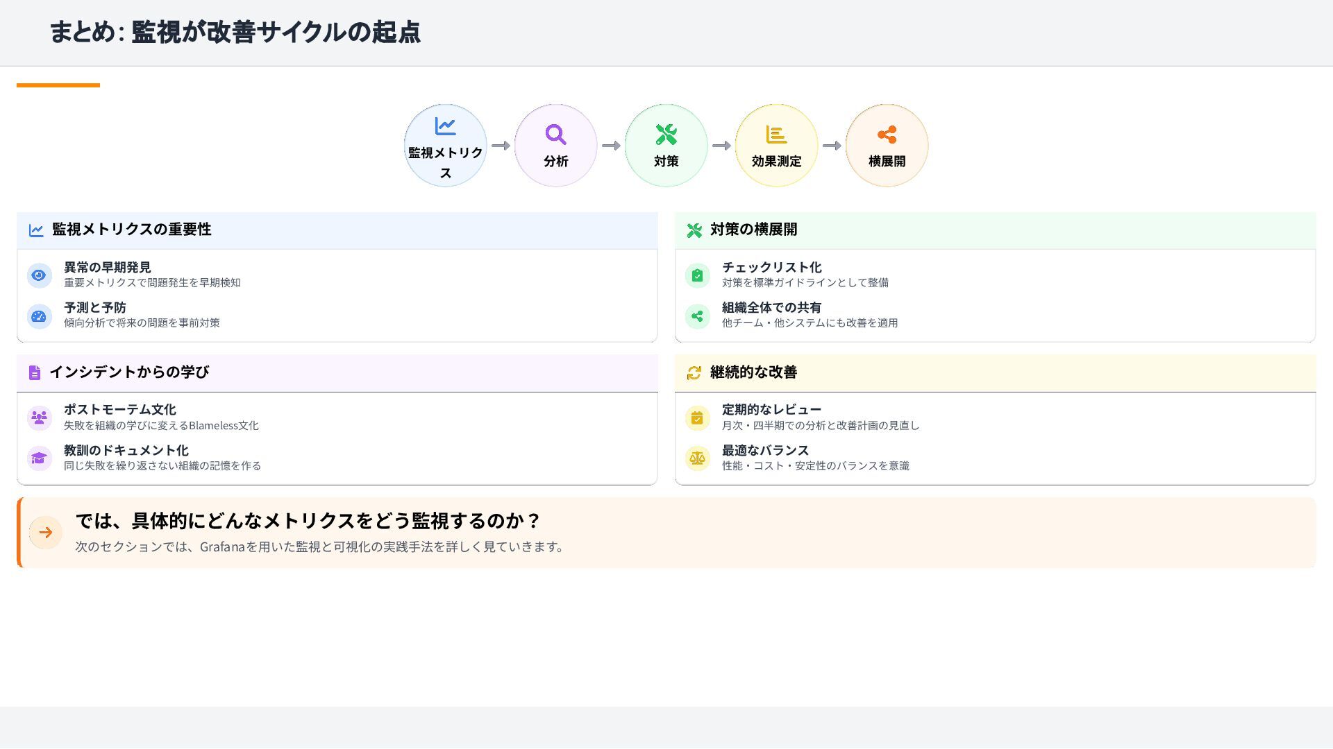 重要メトリクスで問題発⽣を早期検知 予測と予防 傾向分析で将来の問題を事前対策 インシデントからの学び ポストモーテム⽂化 失敗を組織の学びに変えるBlameless⽂化 教訓のドキュメント化 同じ失敗を繰り返さない組織の記憶を作る 対策の横展開 チェックリスト化 対策を標準ガイドラインとして整備 組織全体での共有 他チーム‧他システムにも改善を適⽤ 継続的な改善 定期的なレビュー ⽉次‧四半期での分析と改善計画の⾒直し 最適なバランス 性能‧コスト‧安定性のバランスを意識 では、具体的にどんなメトリクスをどう監視するのか? 次のセクションでは、Grafanaを⽤いた監視と可視化の実践⼿法を詳しく⾒ていきます。