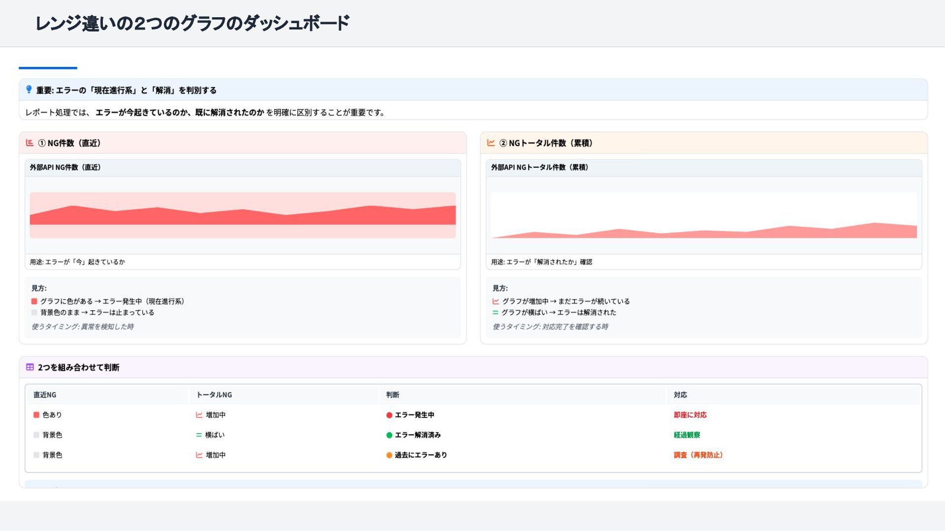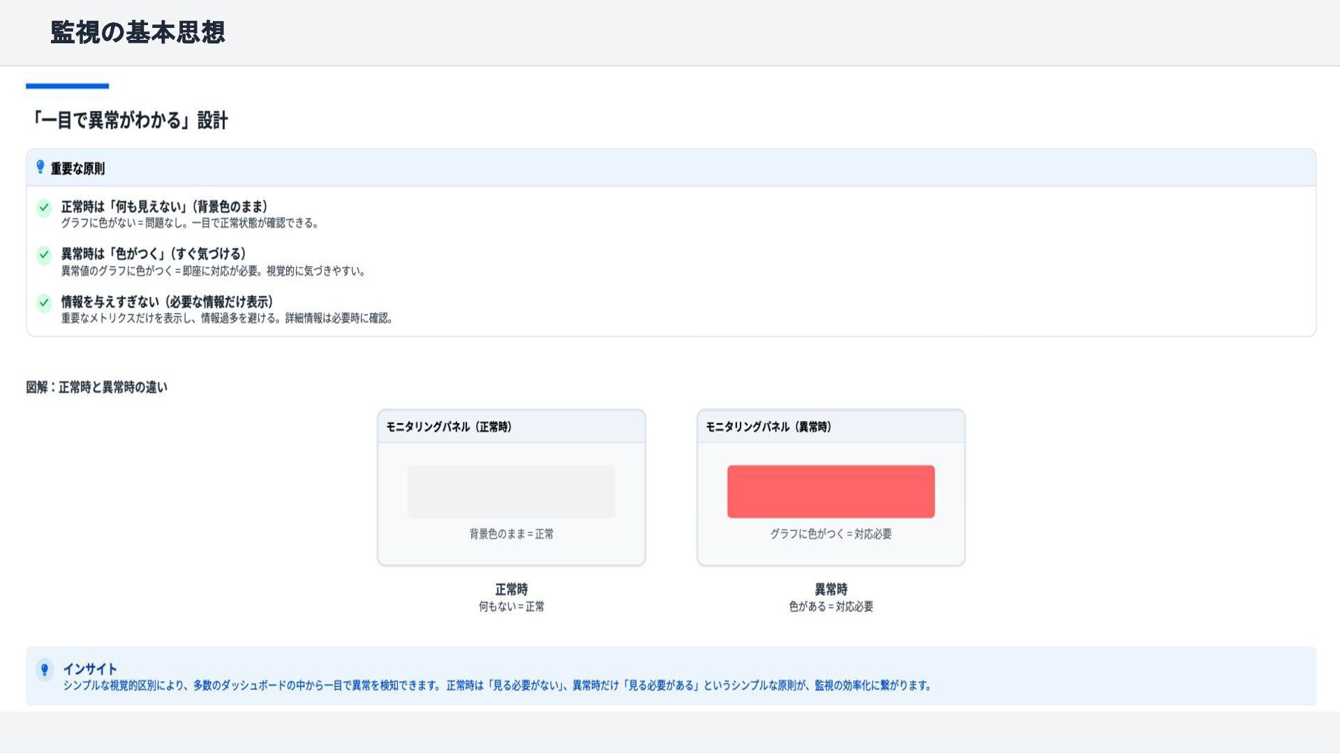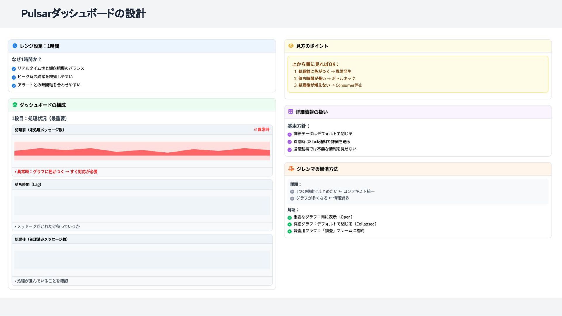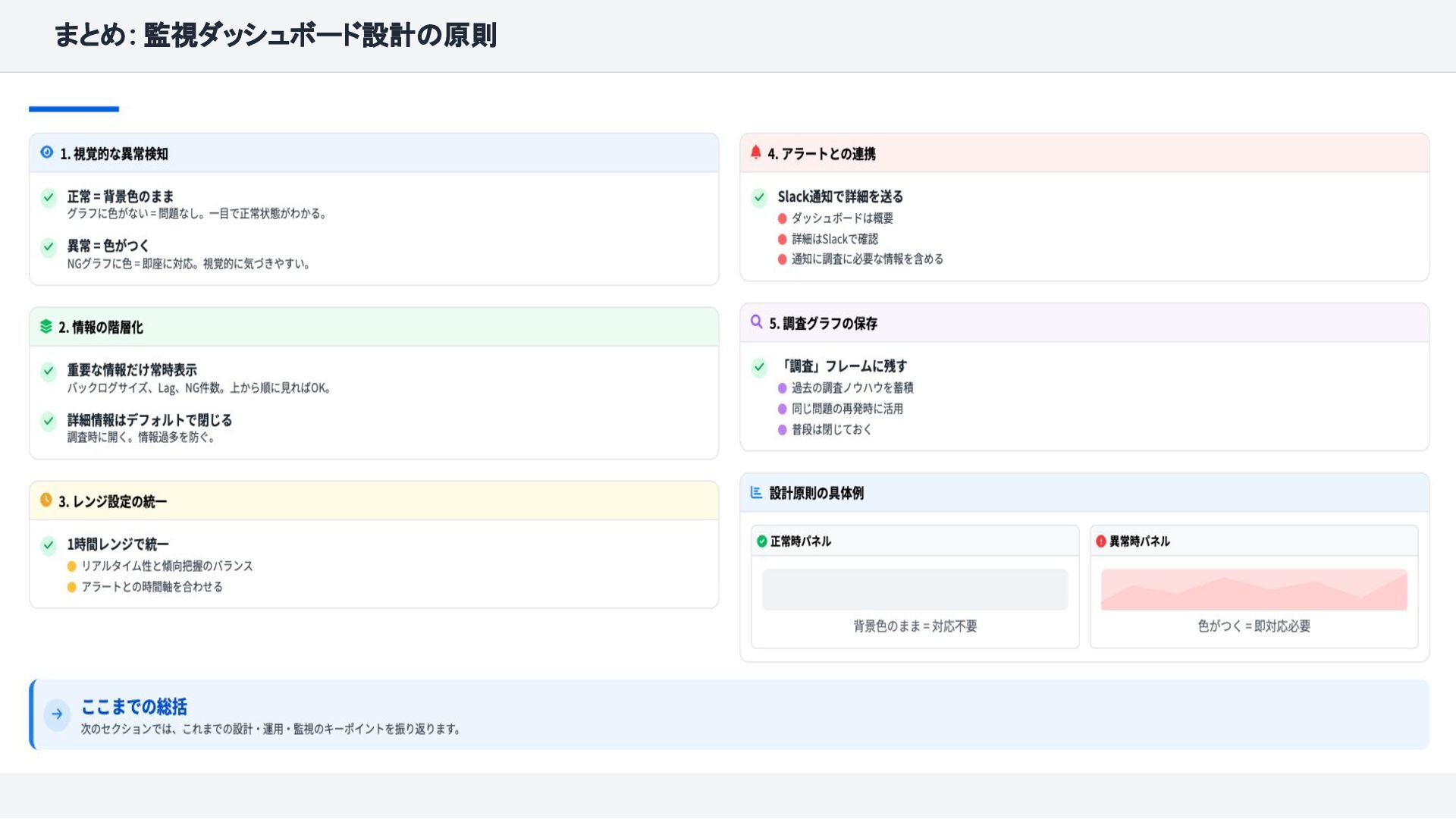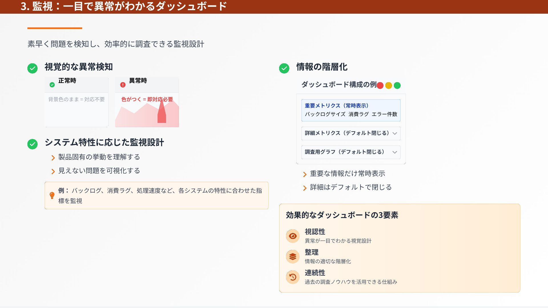 = 即対応必要 システム特性に応じた監視設計 製品固有の挙動を理解する ⾒えない問題を可視化する 例: バックログ、消費ラグ、処理速度など、各システムの特性に合わせた指 標を監視 情報の階層化 ダッシュボード構成の例 重要メトリクス(常時表⽰) バックログサイズ 消費ラグ エラー件数 詳細メトリクス(デフォルト閉じる) 調査⽤グラフ(デフォルト閉じる) 重要な情報だけ常時表⽰ 詳細はデフォルトで閉じる 効果的なダッシュボードの3要素 視認性 異常が⼀⽬でわかる視覚設計 整理 情報の適切な階層化 連続性 過去の調査ノウハウを活⽤できる仕組み