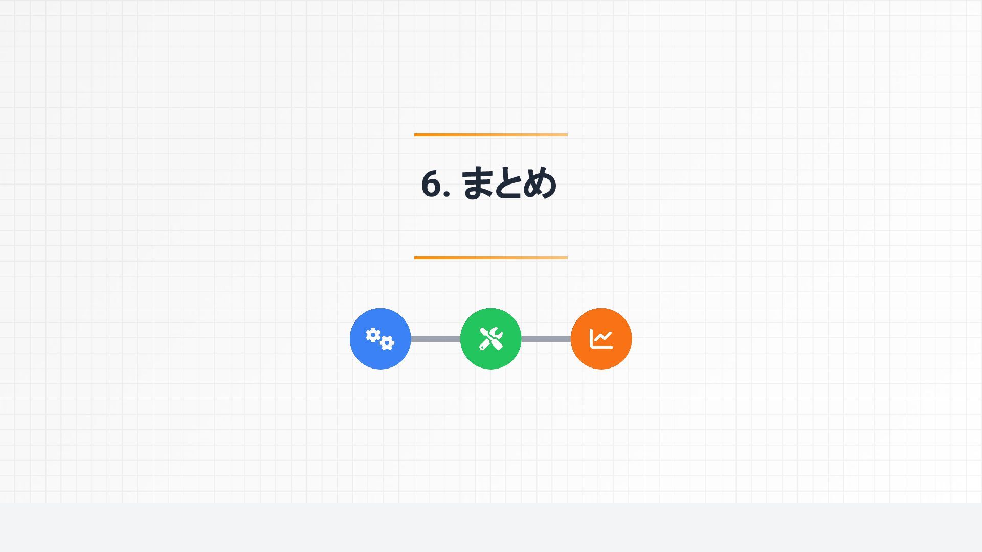 継続的な進化と最適化 3. 監視 ⼀⽬で異常がわかるダッシュボー ドによる迅速な問題発⾒ 3つの柱の連携が不可⽋ 設計‧運⽤‧監視が連携することで、真に"⽌まらない"システムを実現できます