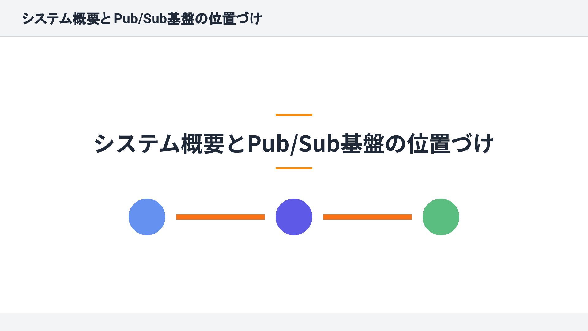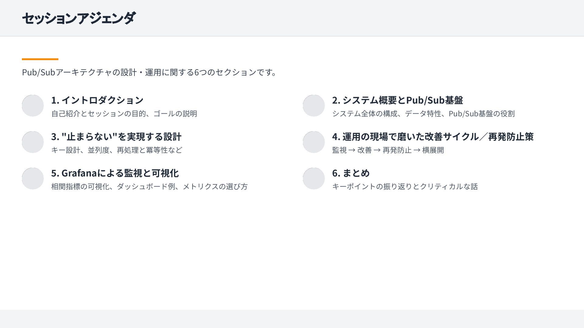 1. セッションアジェンダ Pub/Subアーキテクチャの設計‧運⽤に関する6つのセクションです。 1. イントロダクション ⾃⼰紹介とセッションの⽬的、ゴールの説明 2. システム概要とPub/Sub基盤 システム全体の構成、データ特性、Pub/Sub基盤の役割 3. "⽌まらない"を実現する設計