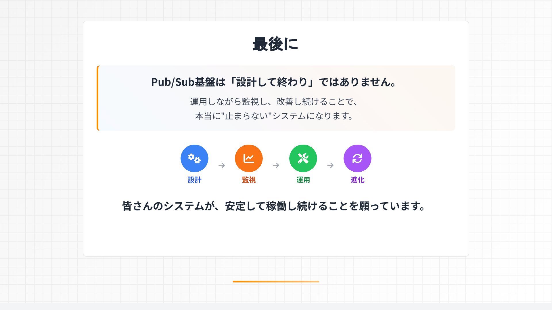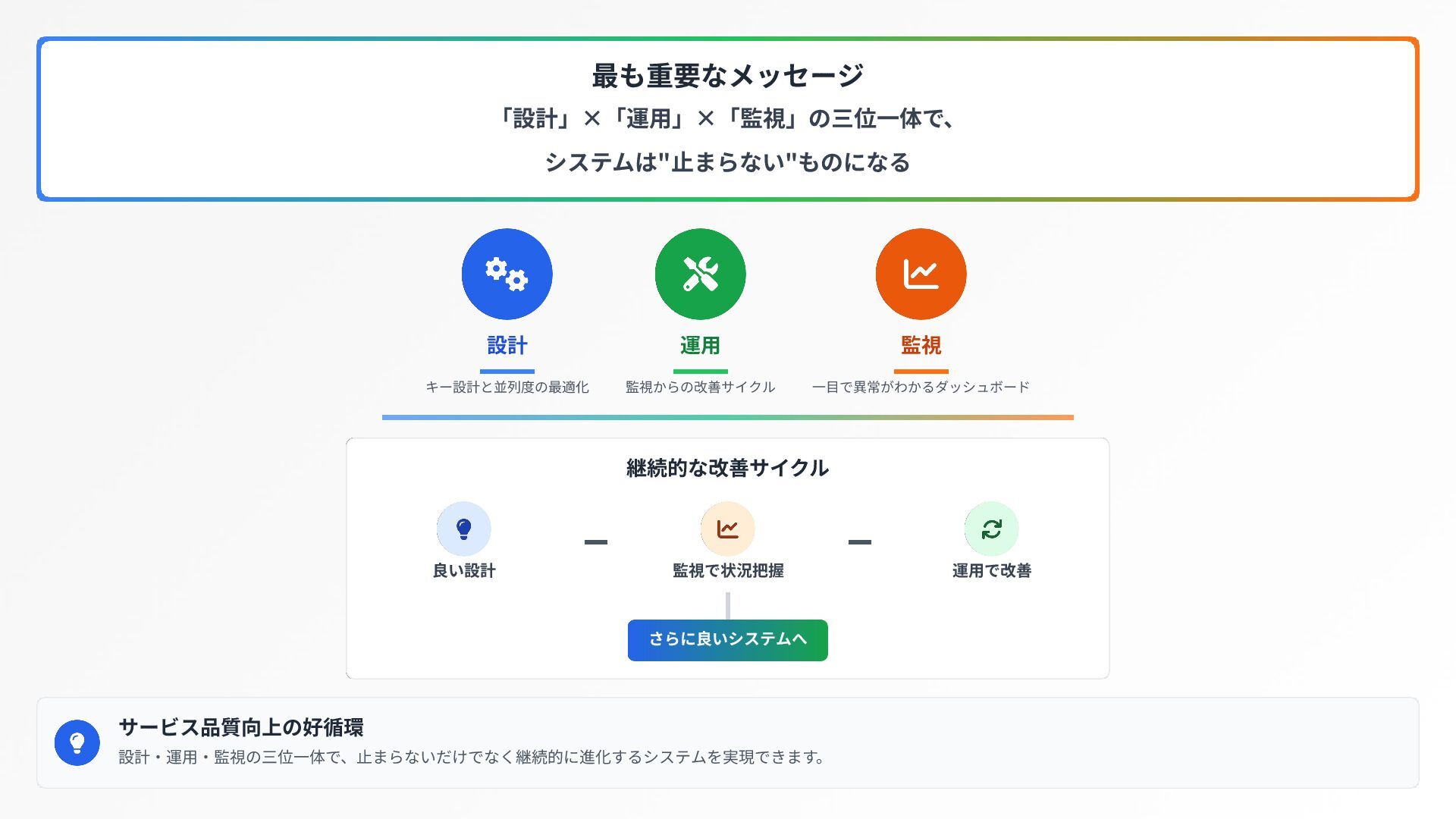 31. 最も重要なメッセージ 「設計」×「運⽤」×「監視」の三位⼀体で、 システムは"⽌まらない"ものになる 設計 キー設計と並列度の最適化 運⽤ 監視からの改善サイクル 監視 ⼀⽬で異常がわかるダッシュボード 継続的な改善サイクル