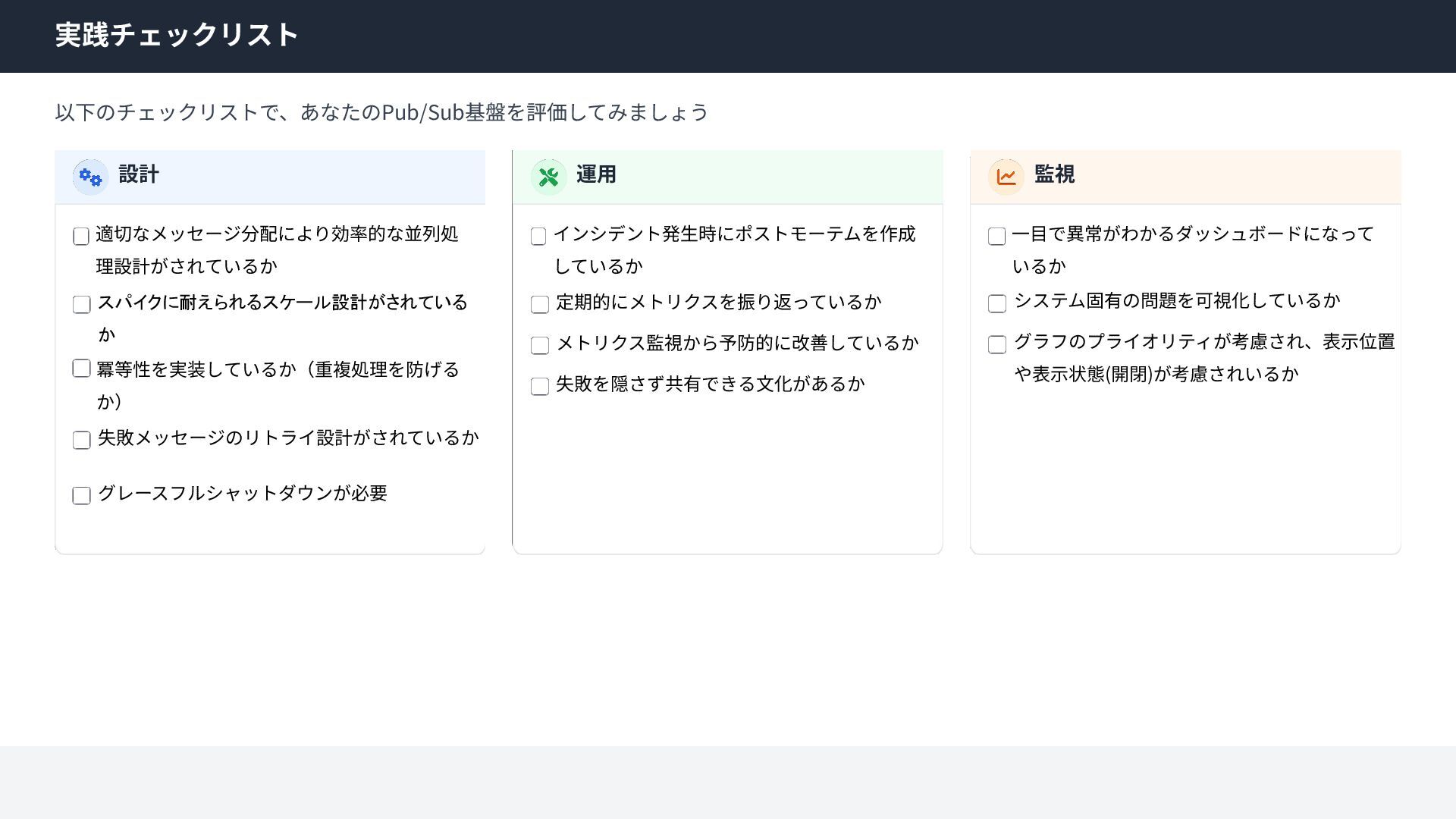 32. 実践チェックリスト 以下のチェックリストで、あなたのPub/Sub基盤を評価してみましょう 設計 適切なメッセージ分配により効率的な並列処 理設計がされているか スパイクに耐えられるスケール設計がされている か 冪等性を実装しているか(重複処理を防げる か) 失敗メッセージのリトライ設計がされているか