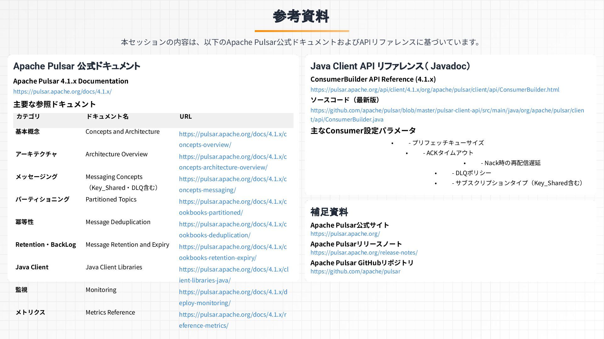 https://pulsar.apache.org/docs/4.1.x/ 主要な参照ドキュメント カテゴリ ドキュメント名 URL 基本概念 Concepts and Architecture https://pulsar.apache.org/docs/4.1.x/c oncepts-overview/ アーキテクチャ Architecture Overview https://pulsar.apache.org/docs/4.1.x/c oncepts-architecture-overview/ メッセージング Messaging Concepts (Key_Shared‧DLQ含む) https://pulsar.apache.org/docs/4.1.x/c oncepts-messaging/ パーティショニング Partitioned Topics https://pulsar.apache.org/docs/4.1.x/c ookbooks-partitioned/ 冪等性 Message Deduplication https://pulsar.apache.org/docs/4.1.x/c ookbooks-deduplication/ Retention‧BackLog Message Retention and Expiry https://pulsar.apache.org/docs/4.1.x/c ookbooks-retention-expiry/ Java Client Java Client Libraries https://pulsar.apache.org/docs/4.1.x/cl ient-libraries-java/ 監視 Monitoring https://pulsar.apache.org/docs/4.1.x/d eploy-monitoring/ メトリクス Metrics Reference https://pulsar.apache.org/docs/4.1.x/r eference-metrics/ Java Client API リファレンス( Javadoc) ConsumerBuilder API Reference (4.1.x) https://pulsar.apache.org/api/client/4.1.x/org/apache/pulsar/client/api/ConsumerBuilder.html ソースコード(最新版) https://github.com/apache/pulsar/blob/master/pulsar-client-api/src/main/java/org/apache/pulsar/clien t/api/ConsumerBuilder.java 主なConsumer設定パラメータ • - プリフェッチキューサイズ • - ACKタイムアウト • - Nack時の再配信遅延 • - DLQポリシー • - サブスクリプションタイプ(Key_Shared含む) 補足資料 Apache Pulsar公式サイト https://pulsar.apache.org/ Apache Pulsarリリースノート https://pulsar.apache.org/release-notes/ Apache Pulsar GitHubリポジトリ https://github.com/apache/pulsar