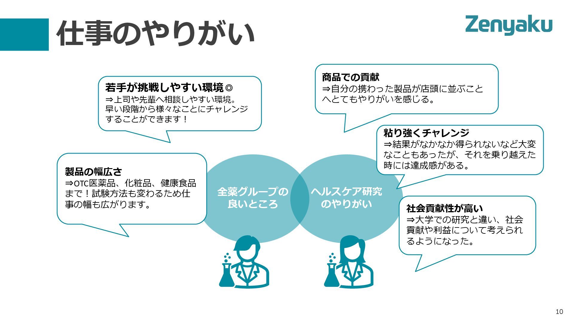 仕事のやりがい 10 ヘルスケア研究 のやりがい 全薬グループの 良いところ 商品での貢献 ⇒自分の携わった製品が店頭に並ぶこと へとてもやりがいを感じる。 若手が挑戦しやすい環境◎