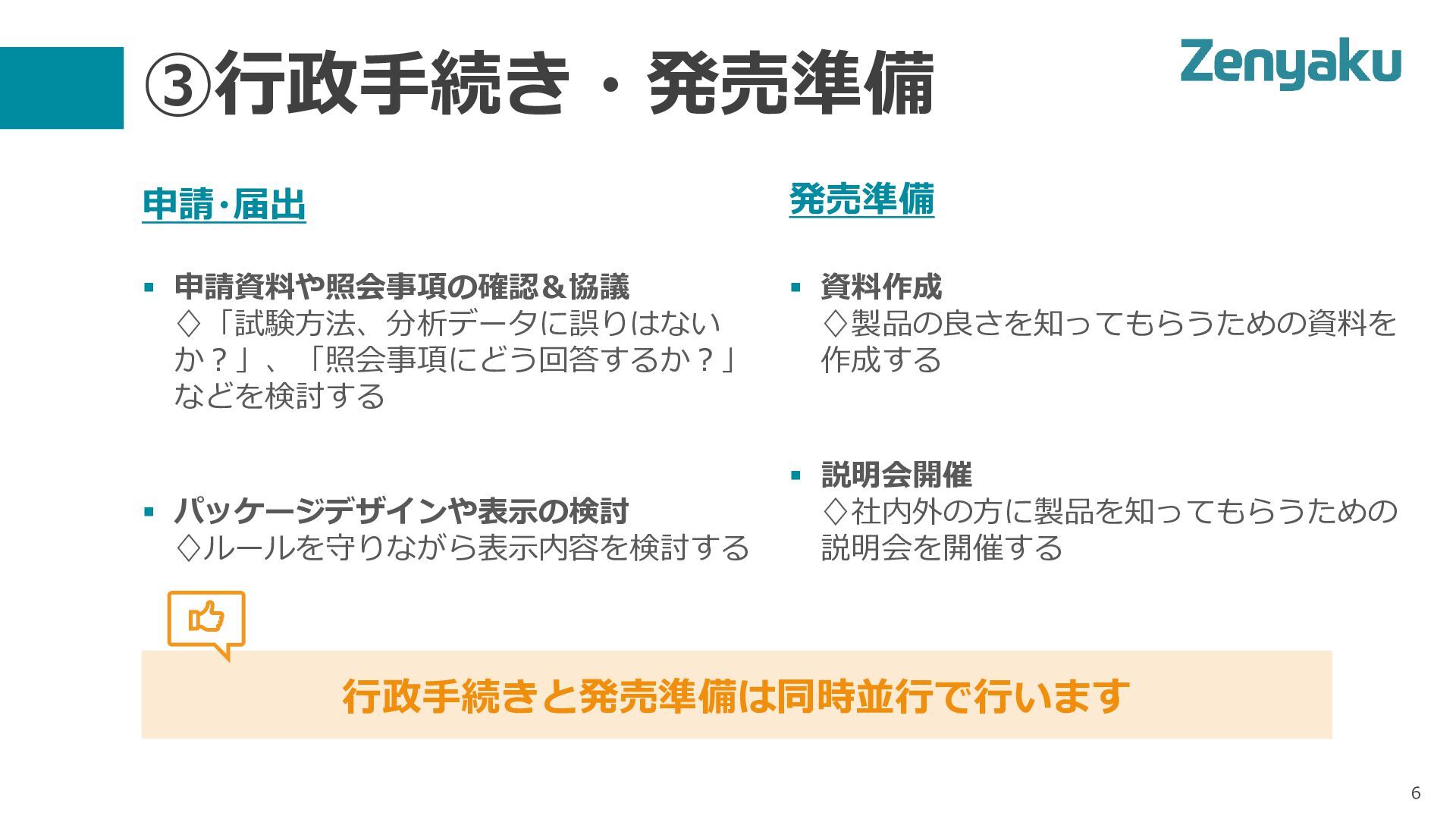 発売準備 ▪ 資料作成 ♢製品の良さを知ってもらうための資料を 作成する ▪ 説明会開催 ♢社内外の方に製品を知ってもらうための 説明会を開催する 6 行政手続きと発売準備は同時並行で行います