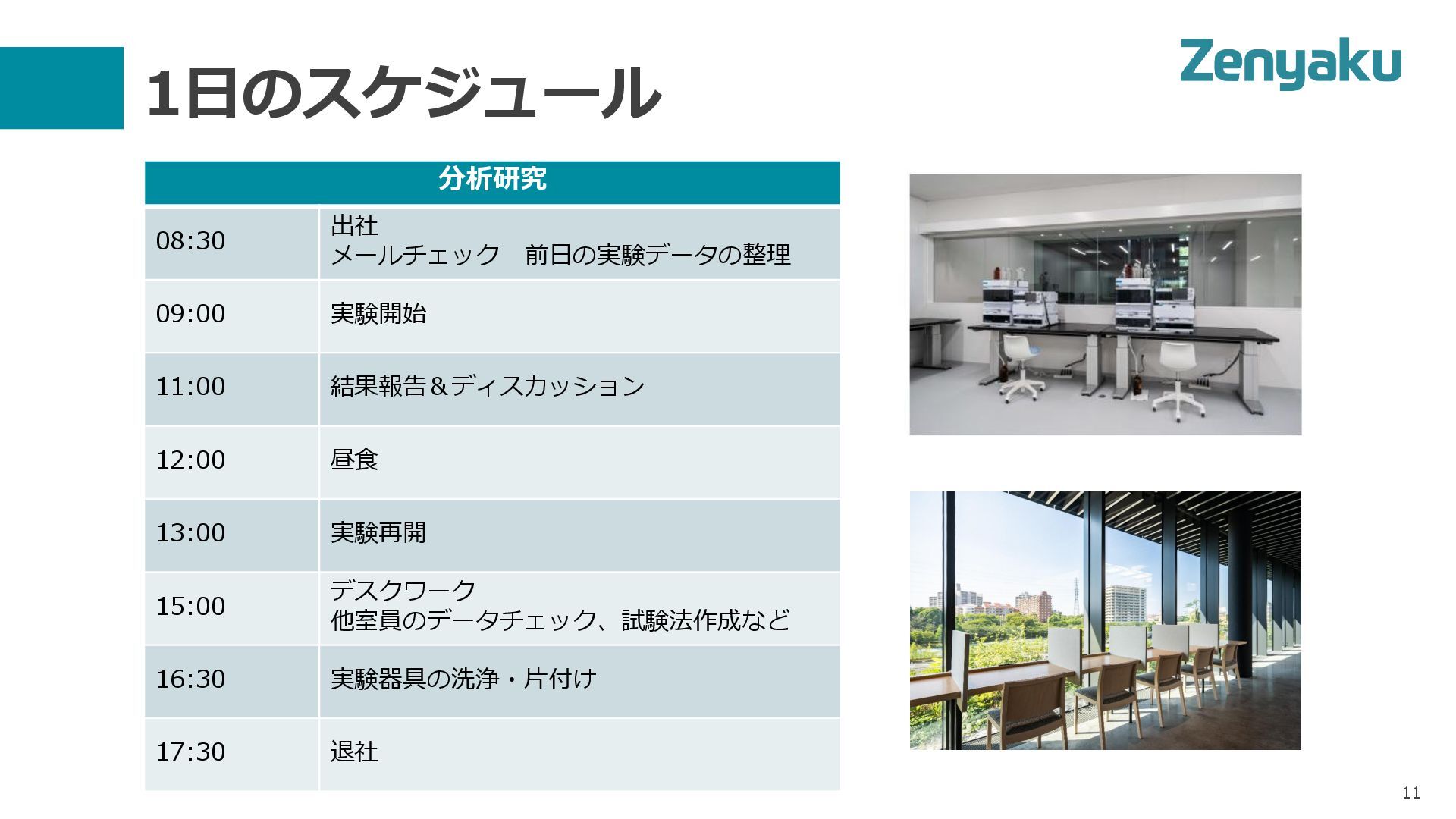 1日のスケジュール 分析研究 08:30 出社 メールチェック 前日の実験データの整理 09:00 実験開始 11:00 結果報告&ディスカッション