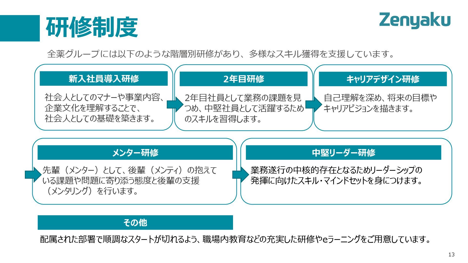研修制度 13 全薬グループには以下のような階層別研修があり、多様なスキル獲得を支援しています。 新入社員導入研修 社会人としてのマナーや事業内容、 企業文化を理解することで、 社会人としての基礎を築きます。 2年目研修 2年目社員として業務の課題を見 つめ、中堅社員として活躍するため