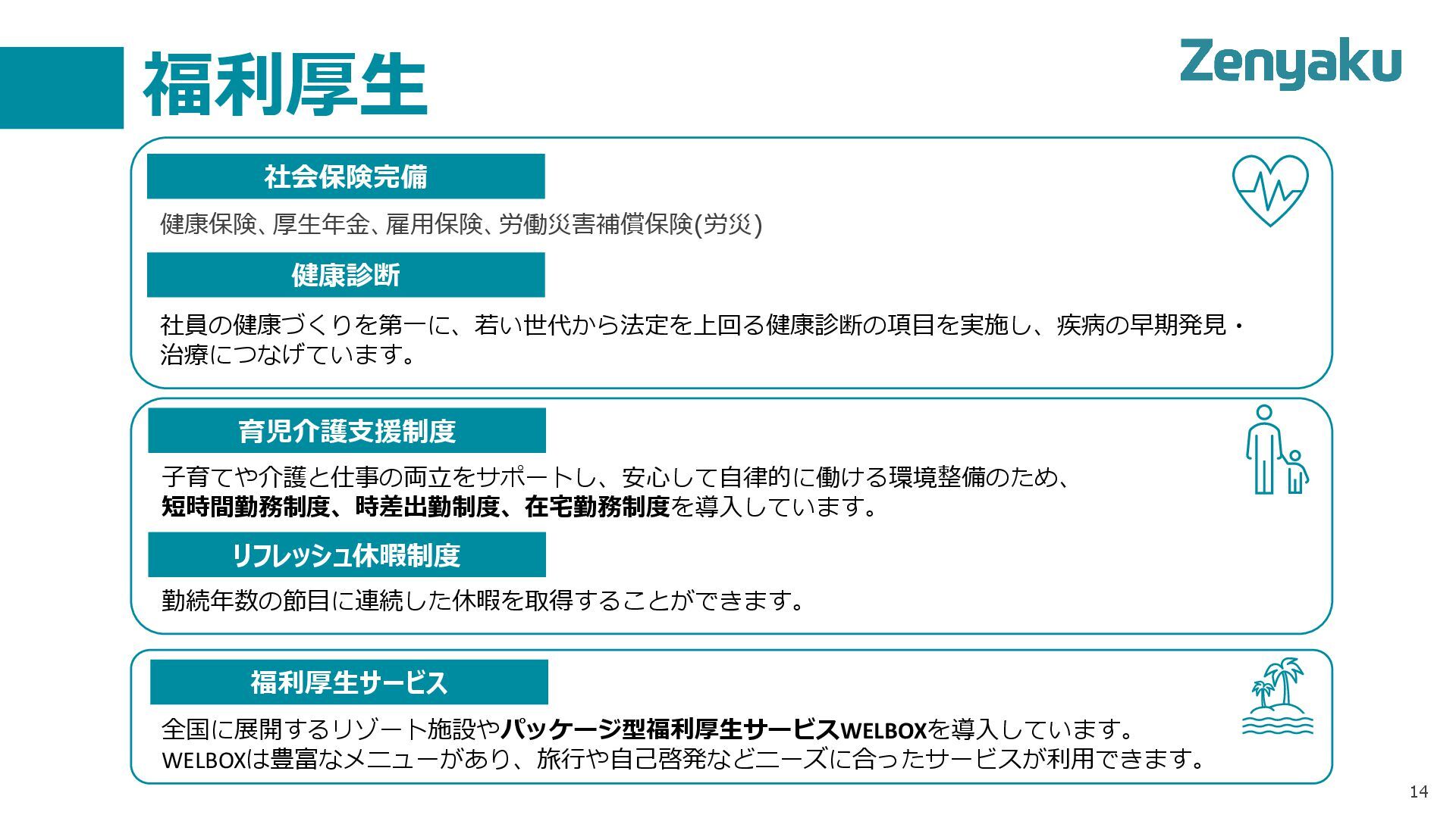 リフレッシュ休暇制度 勤続年数の節目に連続した休暇を取得することができます。 福利厚生サービス 全国に展開するリゾート施設やパッケージ型福利厚生サービスWELBOXを導入しています。 WELBOXは豊富なメニューがあり、旅行や自己啓発などニーズに合ったサービスが利用できます。