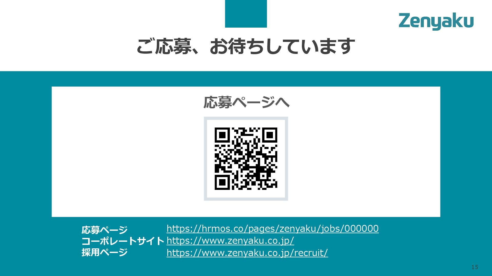 ご応募、お待ちしています 15 応募ページへ https://hrmos.co/pages/zenyaku/jobs/000000 https://www.zenyaku.co.jp/ https://www.zenyaku.co.jp/recruit/ 応募ページ コーポレートサイト 採用ページ