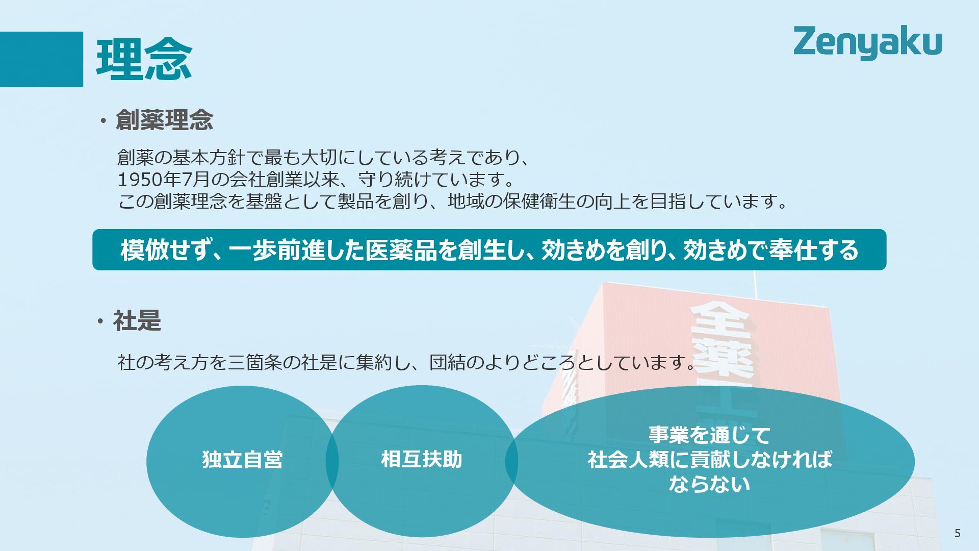 5 理念 創薬の基本方針で最も大切にしている考えであり、 1950年7月の会社創業以来、守り続けています。 この創薬理念を基盤として製品を創り、地域の保健衛生の向上を目指しています。 模倣せず、一歩前進した医薬品を創生し、効きめを創り、効きめで奉仕する ・創薬理念 ・社是 社の考え方を三箇条の社是に集約し、団結のよりどころとしています。 独立自営