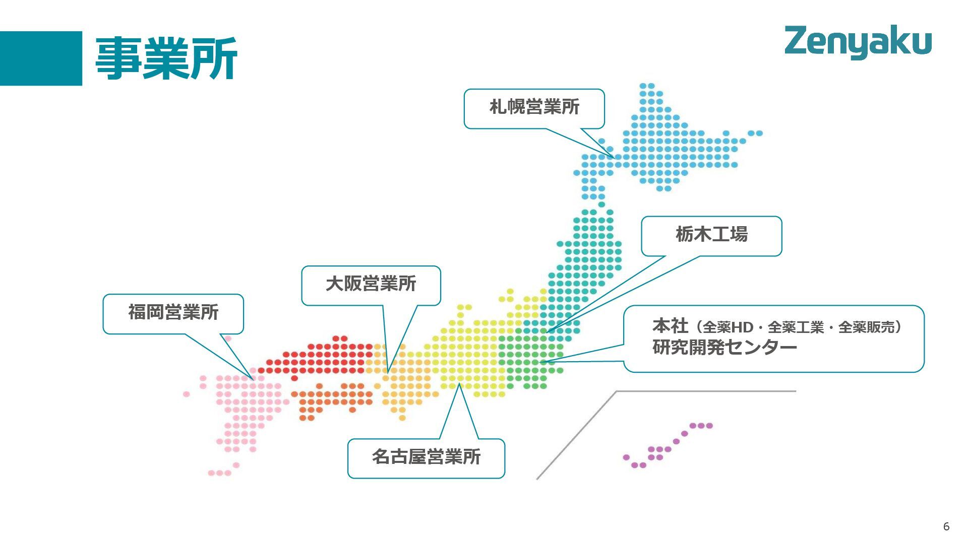 6 事業所 福岡営業所 本社(全薬HD・全薬工業・全薬販売) 研究開発センター 大阪営業所 栃木工場 名古屋営業所 札幌営業所