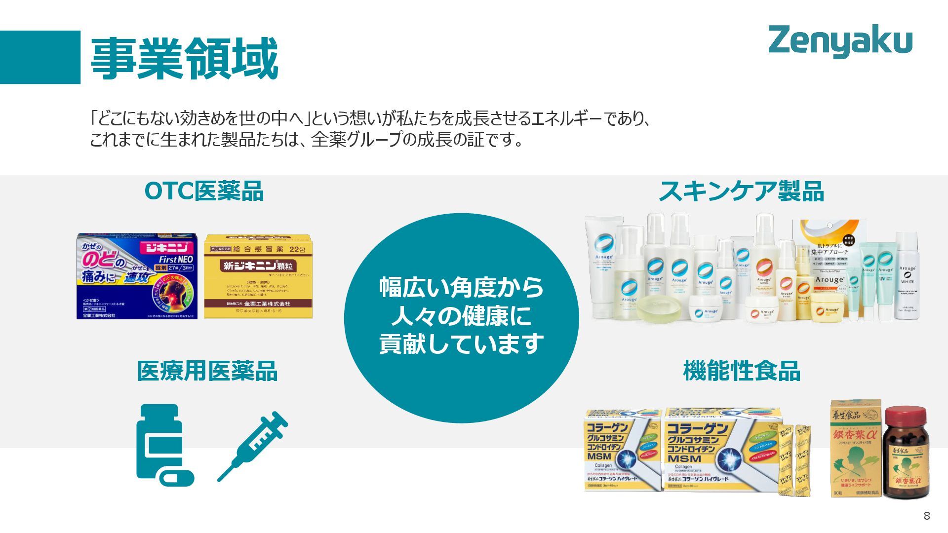 事業領域 8 「どこにもない効きめを世の中へ」という想いが私たちを成長させるエネルギーであり、 これまでに生まれた製品たちは、全薬グループの成長の証です。 OTC医薬品 スキンケア製品 機能性食品 医療用医薬品 幅広い角度から 人々の健康に