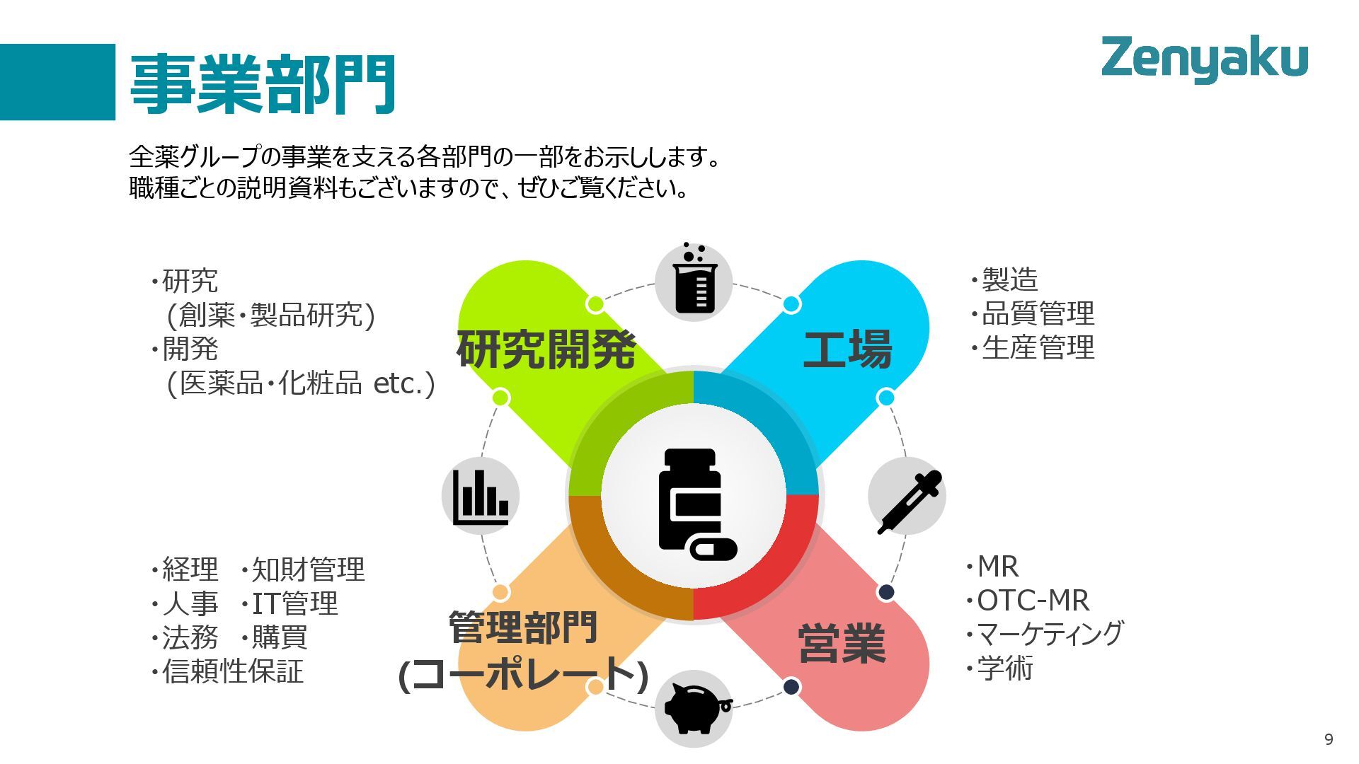 事業部門 9 ・製造 ・品質管理 ・生産管理 ・MR ・OTC-MR ・マーケティング ・学術 ・経理