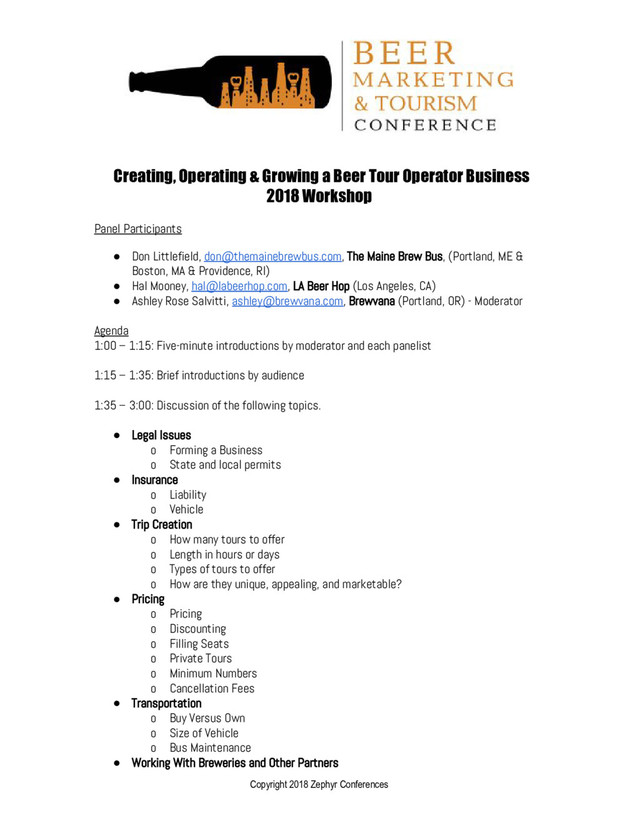 Workshop Panel Participants • Don Littlefield, [email protected], The Maine Brew Bus, (Portland, ME & Boston, MA & Providence, RI) • Hal Mooney, [email protected], LA Beer Hop (Los Angeles, CA) • Ashley Rose Salvitti, [email protected], Brewvana (Portland, OR) - Moderator Agenda 1:00 – 1:15: Five-minute introductions by moderator and each panelist 1:15 – 1:35: Brief introductions by audience 1:35 – 3:00: Discussion of the following topics. • Legal Issues o Forming a Business o State and local permits • Insurance o Liability o Vehicle • Trip Creation o How many tours to offer o Length in hours or days o Types of tours to offer o How are they unique, appealing, and marketable? • Pricing o Pricing o Discounting o Filling Seats o Private Tours o Minimum Numbers o Cancellation Fees • Transportation o Buy Versus Own o Size of Vehicle o Bus Maintenance • Working With Breweries and Other Partners Copyright 2018 Zephyr Conferences