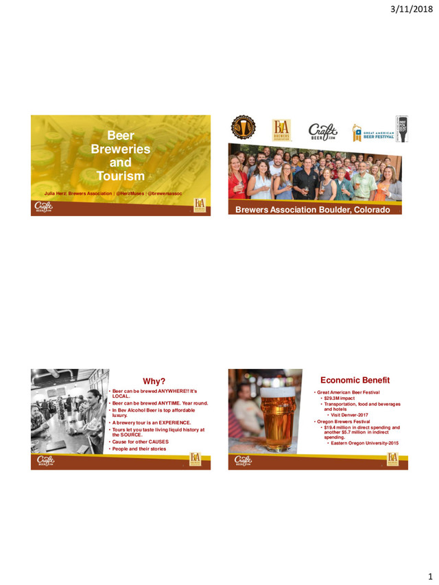 (1 bbl = 31 gallons) 1981 177,034 5,221 35 2016 139,278 33,366 24,105 Change -37,756 28,145 24,070 DEPARTMENT OF THE TREASURY Alcohol and Tobacco Tax and Trade Bureau NUMBER OF BREWERS BY PRODUCTION SIZE - CY 2016 Revised: 10/25/2017 Production Size - CY 2016 Barrels (31 gallons) Number of Breweries Taxable Removals % of Breweries % of Removals 6,000,001 Barrels and Over 14 119,774,531.97 0.3% 69.3% 2,000,000 to 6,000,000 Barrels 7 25,147,830.59 0.1% 14.5% 1,000,001 to 1,999,999 Barrels 4 4,994,536.90 0.1% 2.9% 500,001 to 1,000,000 Barrels 6 4,014,943.39 0.1% 2.3% 100,001 to 500,000 Barrels 45 8,618,323.45 0.9% 5.0% 60,001 to 100,000 Barrels 38 2,395,062.26 0.7% 1.4% 30,001 to 60,000 Barrels 53 2,069,205.94 1.0% 1.2% 15,001 to 30,000 Barrels 75 1,341,223.91 1.5% 0.8% 7,501 to 15,000 Barrels 148 1,351,541.96 2.9% 0.8% 1,001 to 7,500 Barrels 935 2,282,897.14 18.3% 1.3% 0 to 1,000 Barrels 3,771 967,080.60 74.0% 0.6% Total 5,096 172,957,178.11 100.0% 100.0% 0 1,000 2,000 3,000 4,000 5,000 6,000 1873 1878 1883 1888 1893 1898 1903 1908 1913 1918 1934 1939 1944 1949 1954 1959 1964 1969 1974 1979 1984 1989 1994 1999 2004 2009 2014 Number of Breweries, 1873 - 2016 Sources: Brewers Association Brewery Opportunity •Nearly 1,000 cities with a population of more than 10,000 don't have a local brewery YET. 16