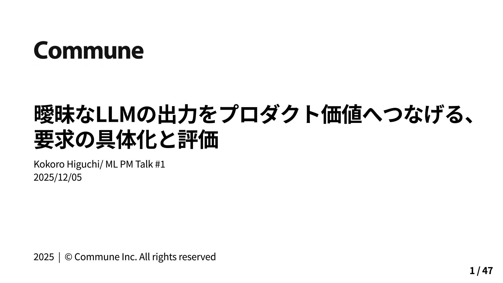 曖昧なLLMの出力をプロダクト価値へつなげる、 要求の具体化と評価 Kokoro Higuchi/ ML PM Talk #1 2025/12/05 2025