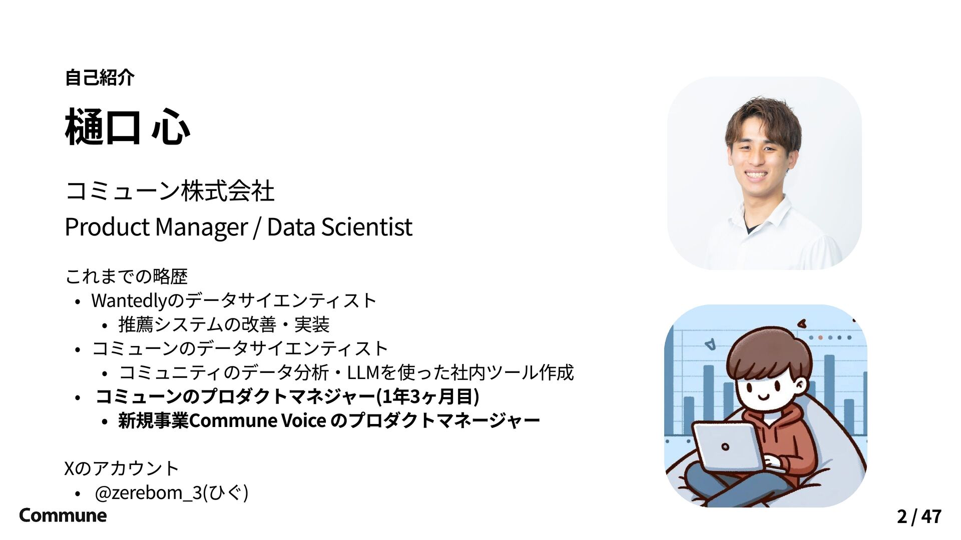 コミュニティのデータ分析・LLMを使った社内ツール作成 コミューンのプロダクトマネジャー(1年3ヶ月目) 新規事業Commune Voice のプロダクトマネージャー Xのアカウント @zerebom_3(ひぐ) 自己紹介 樋口 心 2 / 47