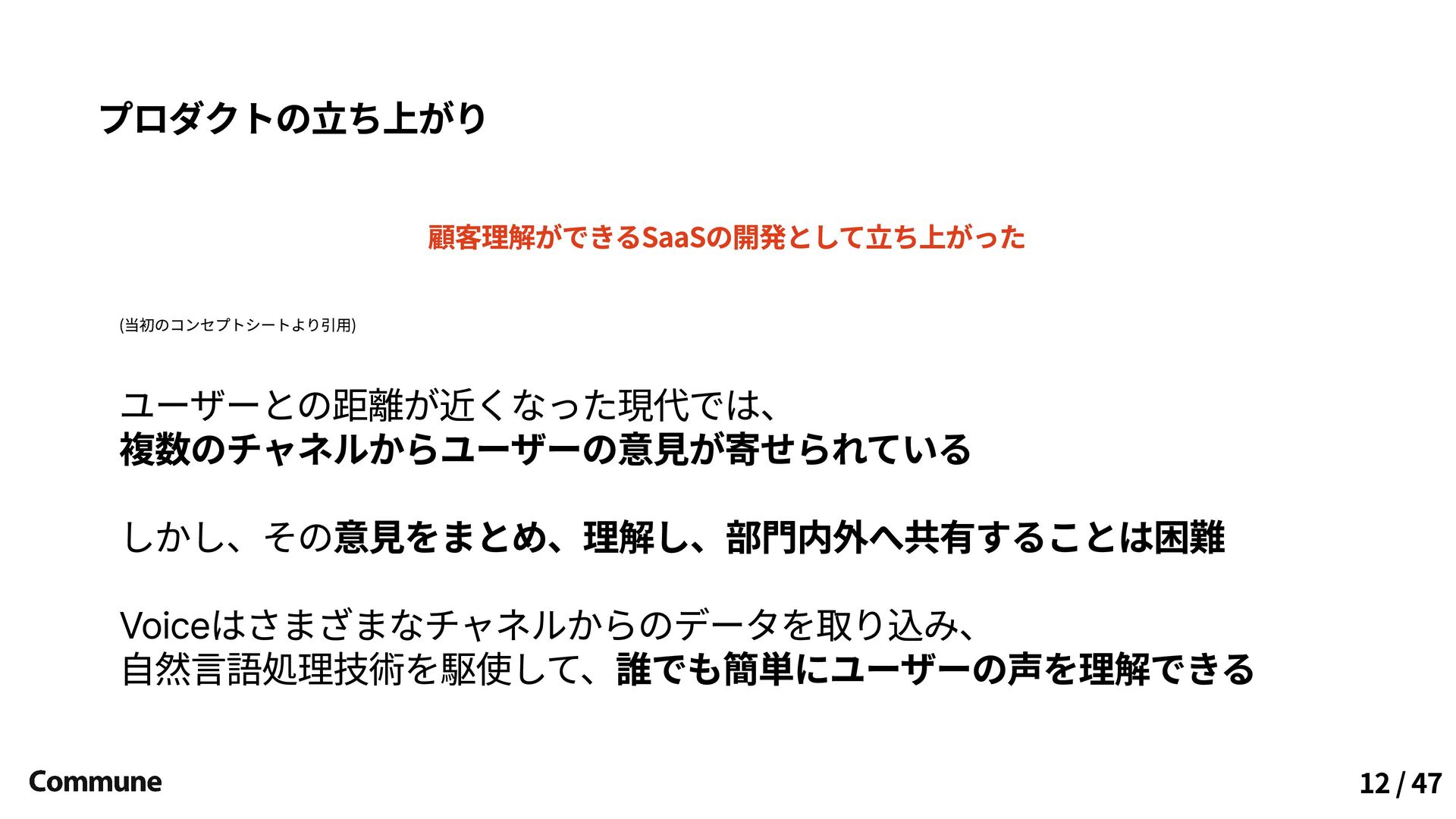 プロダクトの立ち上がり (当初のコンセプトシートより引用) ユーザーとの距離が近くなった現代では、 複数のチャネルからユーザーの意見が寄せられている しかし、その意見をまとめ、理解し、部門内外へ共有することは困難 Voiceはさまざまなチャネルからのデータを取り込み、 自然言語処理技術を駆使して、誰でも簡単にユーザーの声を理解できる 12 / 47