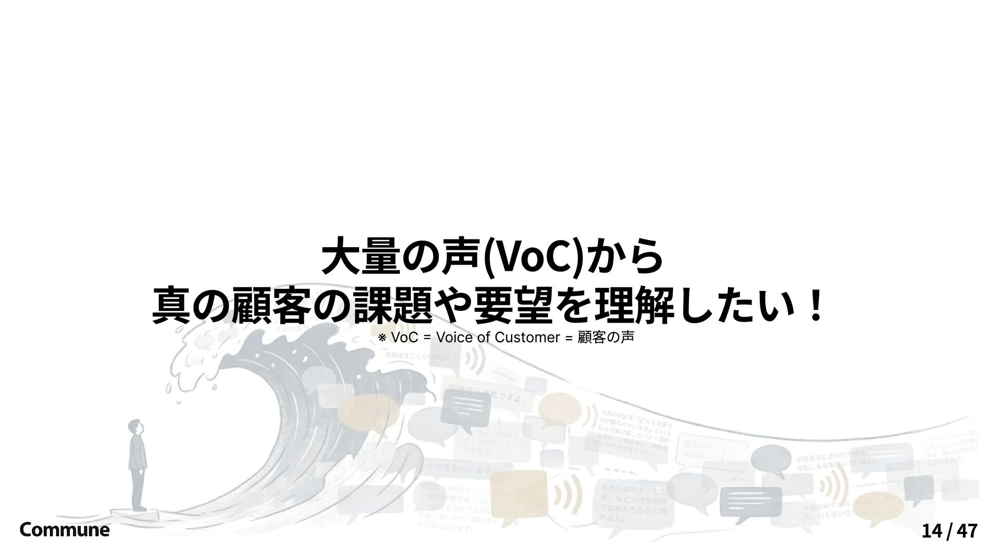 大量の声(VoC)から 真の顧客の課題や要望を理解したい! ※ VoC = Voice of Customer = 顧客の声