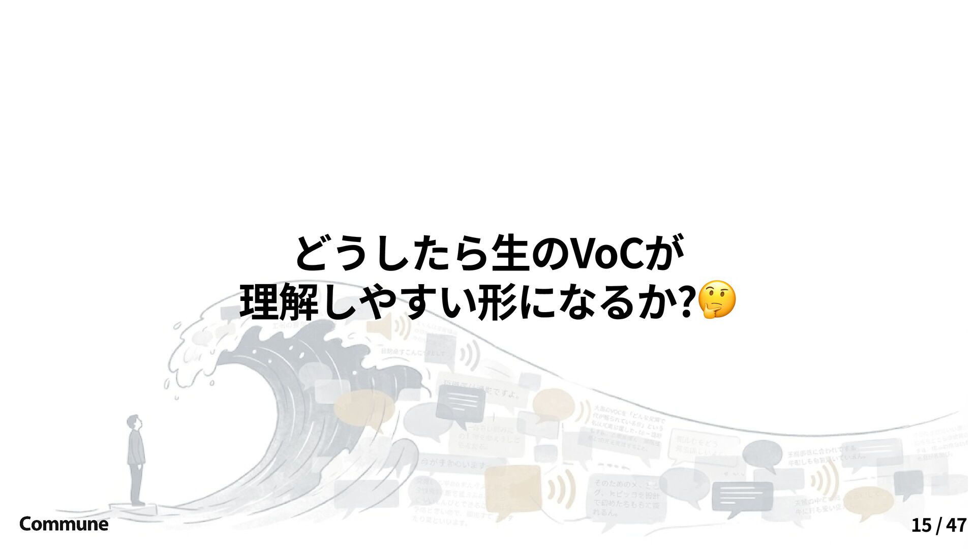 どうしたら生のVoCが 理解しやすい形になるか? 15 / 47