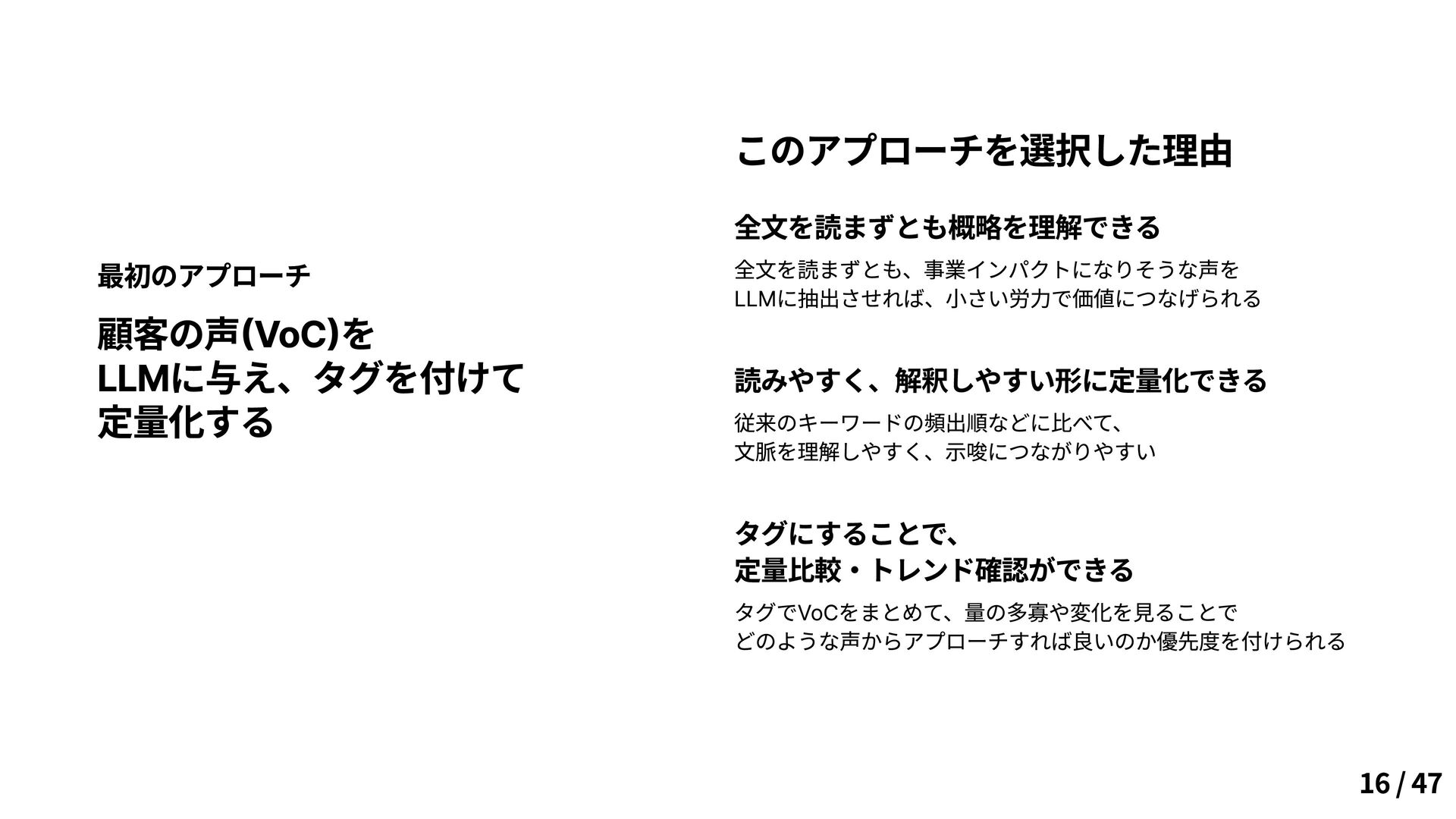 顧客の声(VoC)を LLMに与え、タグを付けて 定量化する 全文を読まずとも概略を理解できる 全文を読まずとも、事業インパクトになりそうな声を LLMに抽出させれば、小さい労力で価値につなげられる 読みやすく、解釈しやすい形に定量化できる 従来のキーワードの頻出順などに比べて、 文脈を理解しやすく、示唆につながりやすい タグにすることで、