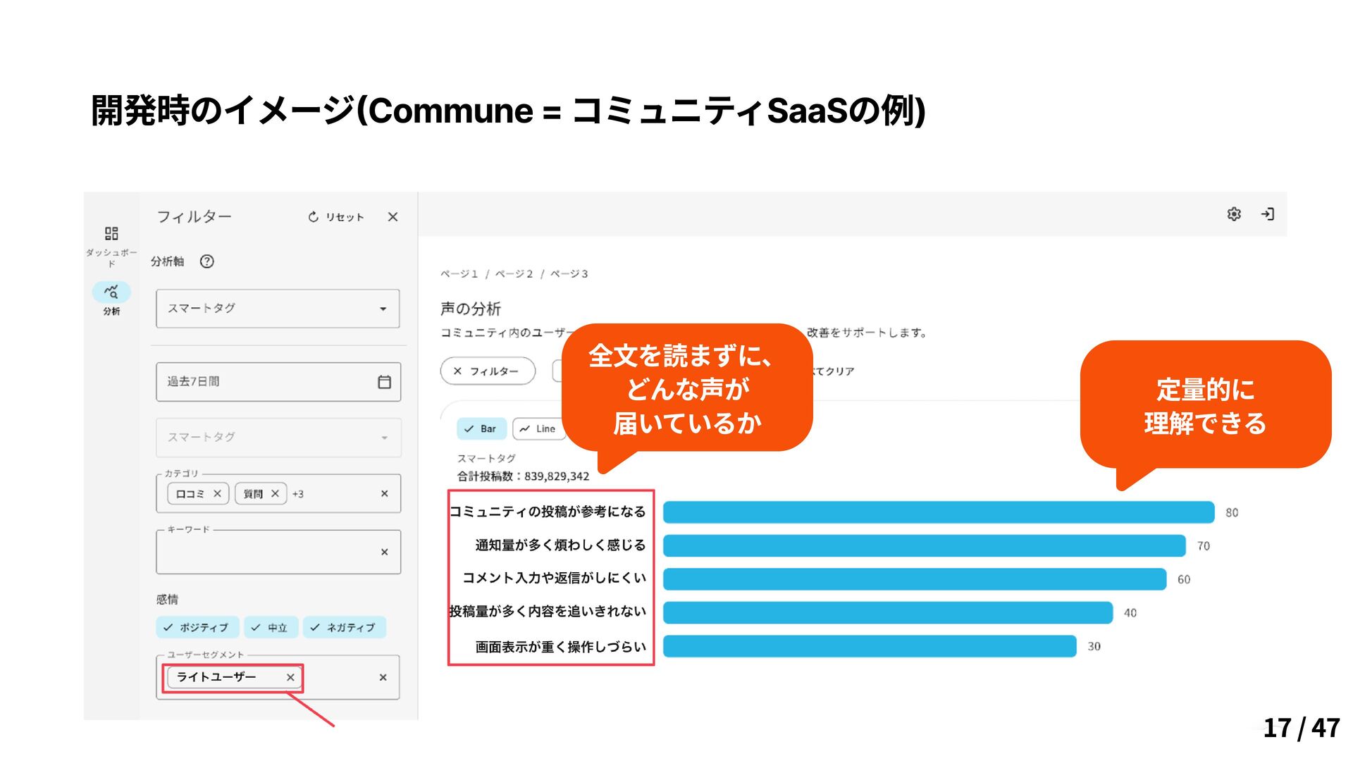 開発時のイメージ(Commune = コミュニティSaaSの例) 全文を読まずに、 どんな声が 届いているか 定量的に 理解できる 17 /