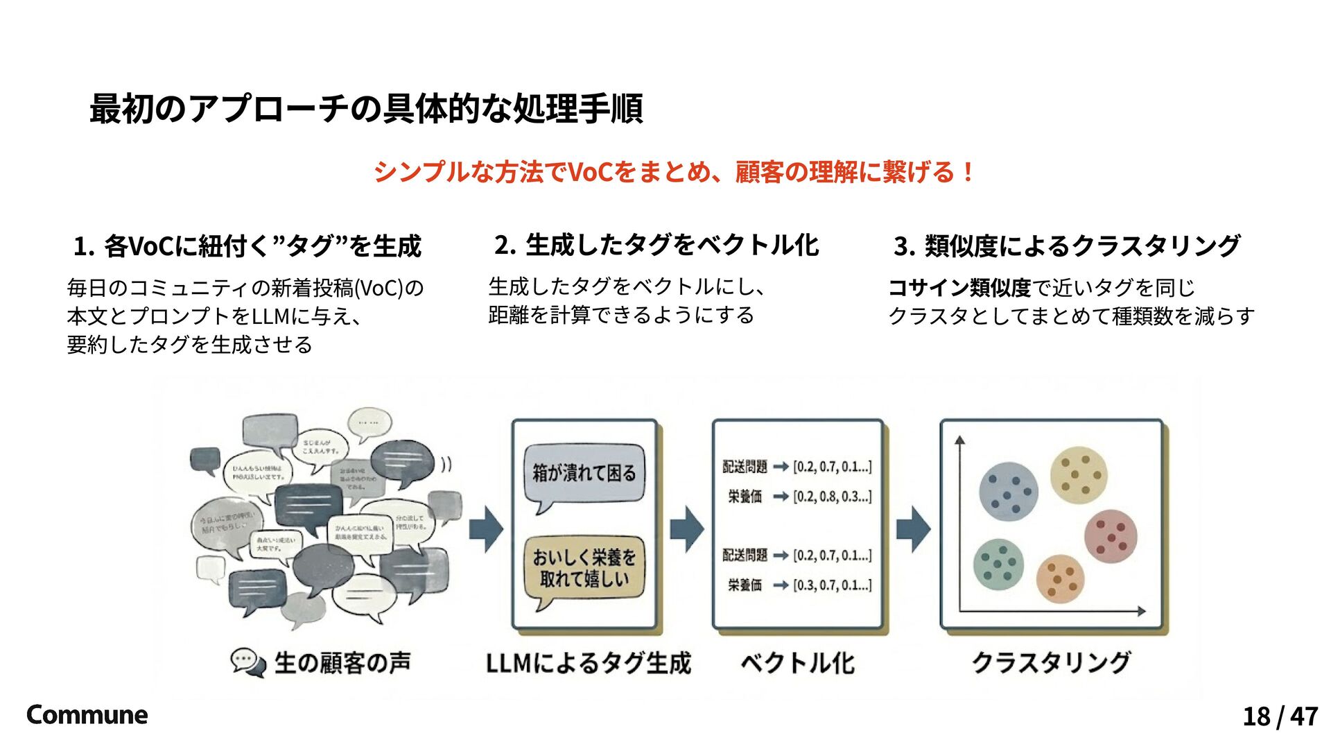 最初のアプローチの具体的な処理手順 各VoCに紐付く”タグ”を生成 毎日のコミュニティの新着投稿(VoC)の 本文とプロンプトをLLMに与え、 要約したタグを生成させる 生成したタグをベクトル化 生成したタグをベクトルにし、 距離を計算できるようにする 類似度によるクラスタリング コサイン類似度で近いタグを同じ