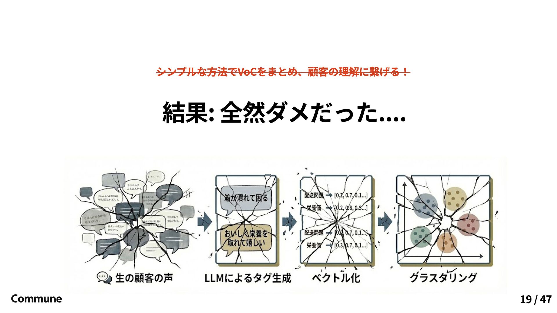 結果: 全然ダメだった.... シンプルな方法でVoCをまとめ、顧客の理解に繋げる! 19 / 47