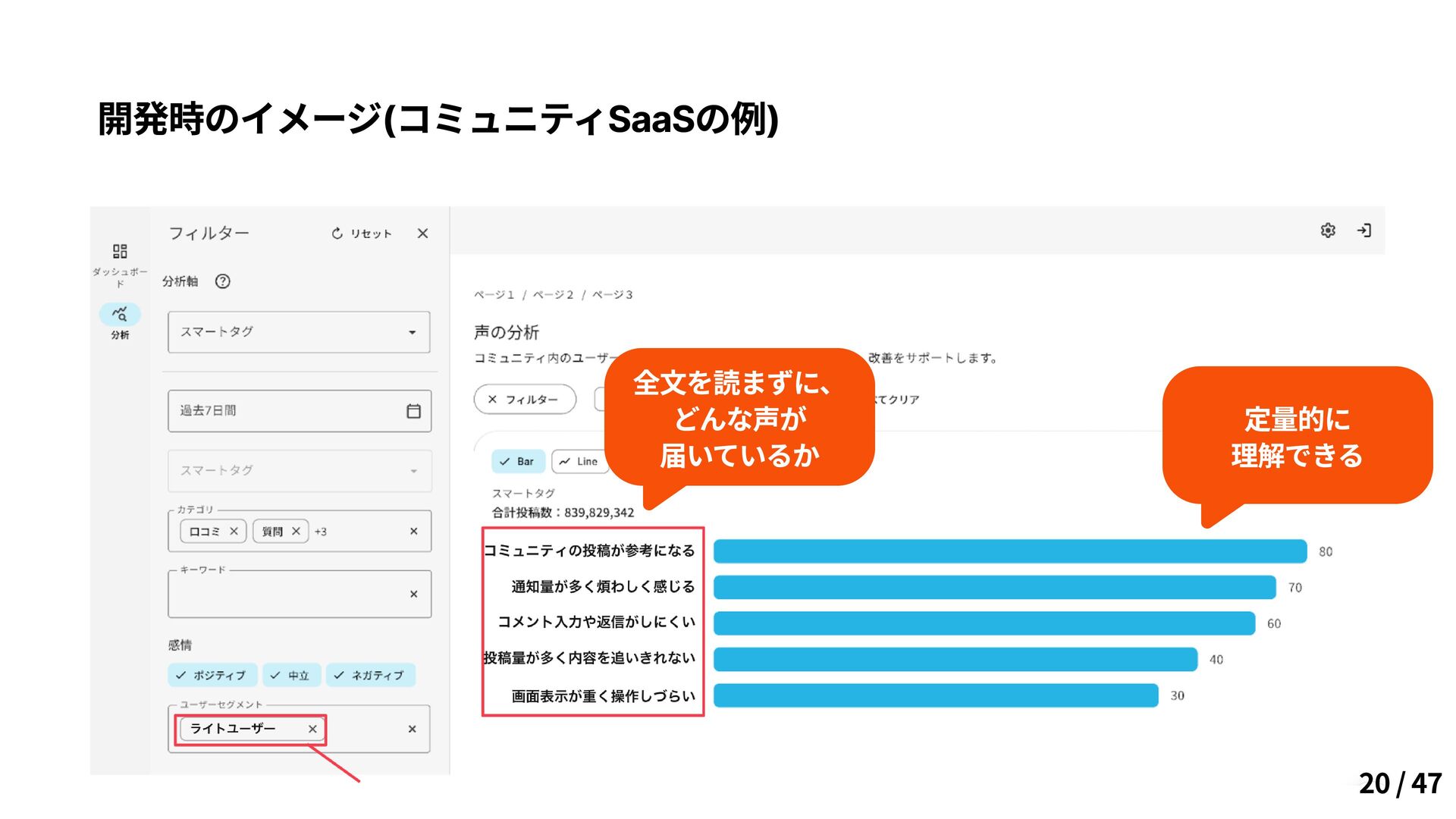 開発時のイメージ(コミュニティSaaSの例) 全文を読まずに、 どんな声が 届いているか 定量的に 理解できる 20 / 47