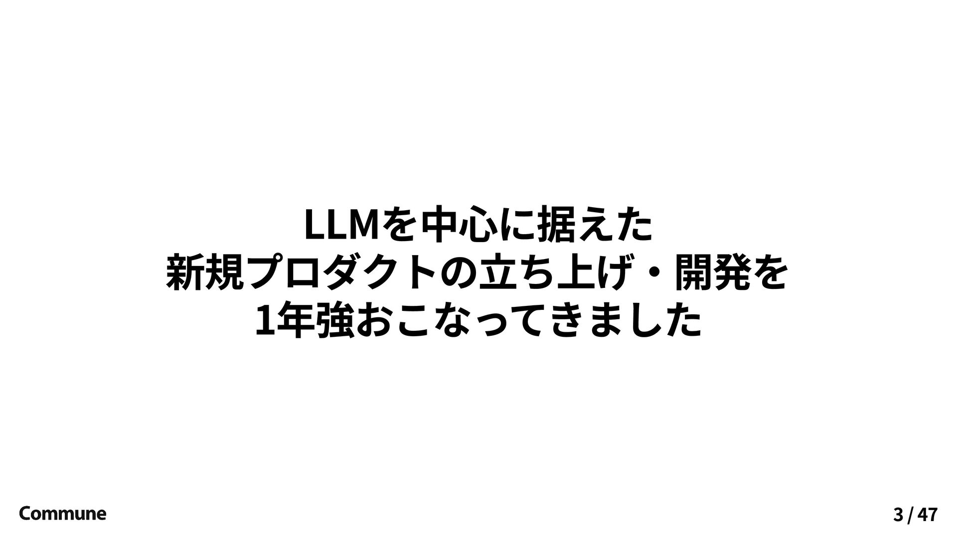 LLMを中心に据えた 新規プロダクトの立ち上げ・開発を 1年強おこなってきました 3 / 47