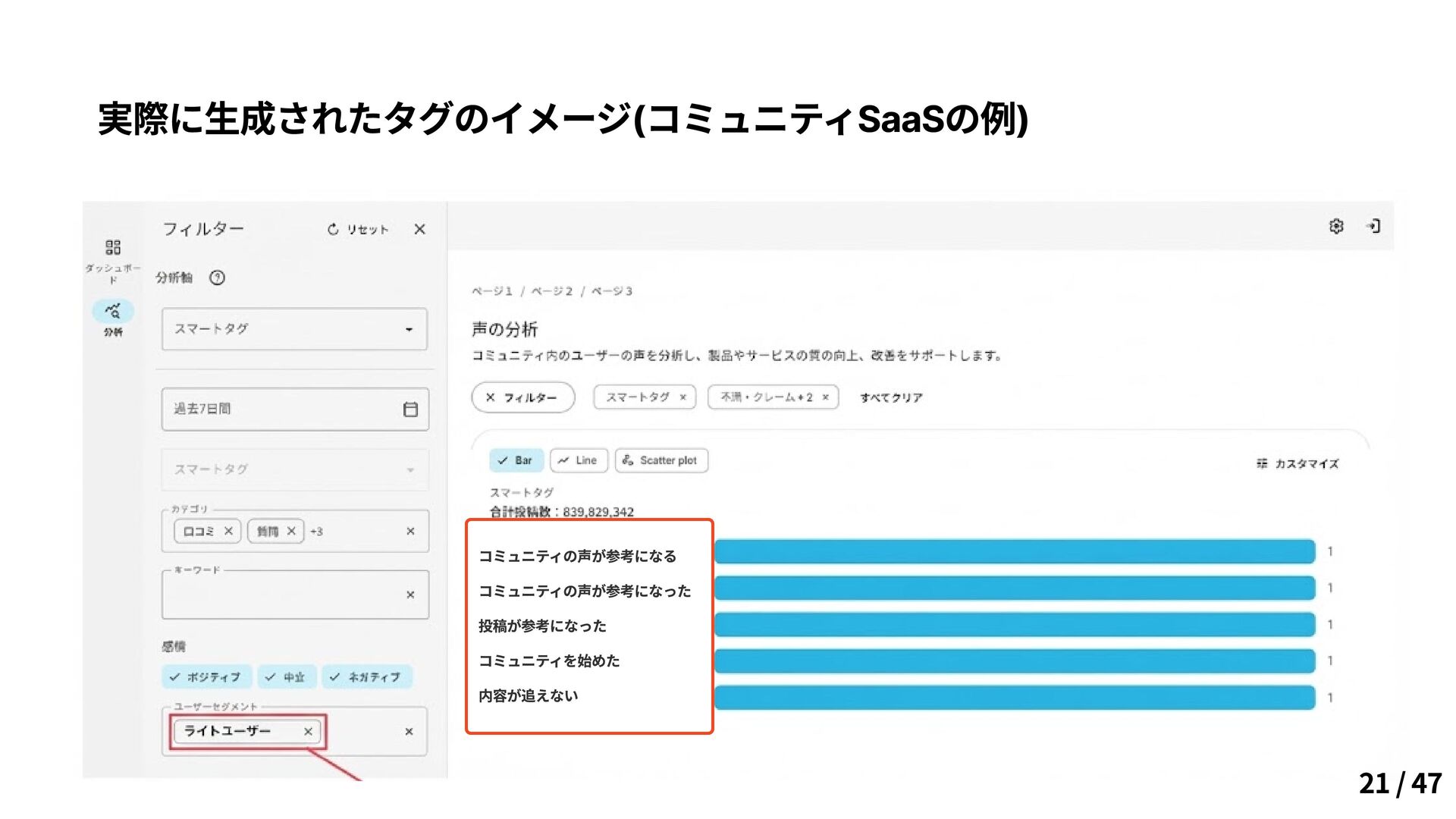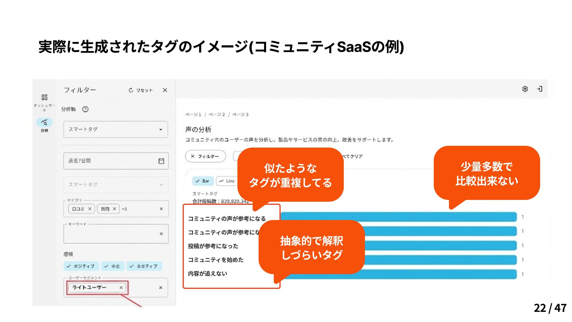 実際に生成されたタグのイメージ(コミュニティSaaSの例) コミュニティの声が参考になる コミュニティの声が参考になった 投稿が参考になった コミュニティを始めた 内容が追えない 21 / 47