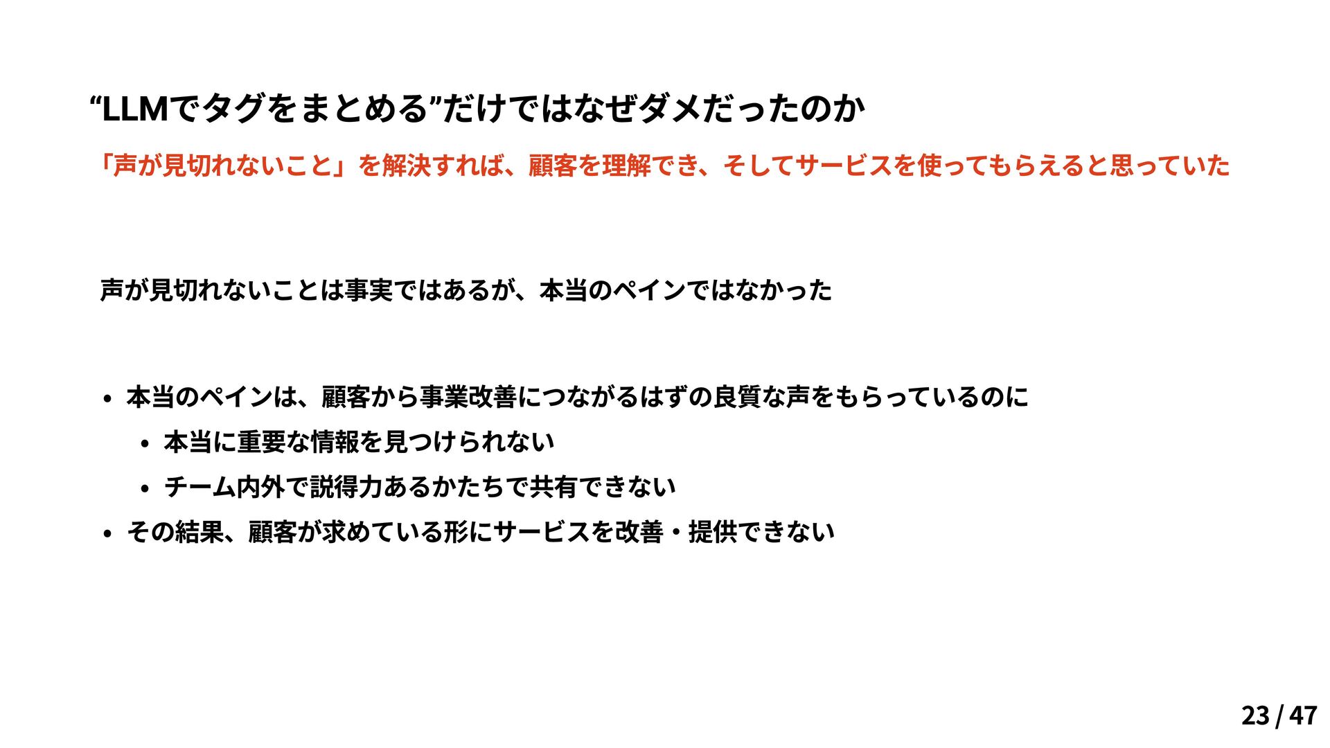 “LLMでタグをまとめる”だけではなぜダメだったのか 「声が見切れないこと」を解決すれば、顧客を理解でき、そしてサービスを使ってもらえると思っていた 本当のペインは、顧客から事業改善につながるはずの良質な声をもらっているのに 本当に重要な情報を見つけられない チーム内外で説得力あるかたちで共有できない その結果、顧客が求めている形にサービスを改善・提供できない 23 / 47 声が見切れないことは事実ではあるが、本当のペインではなかった