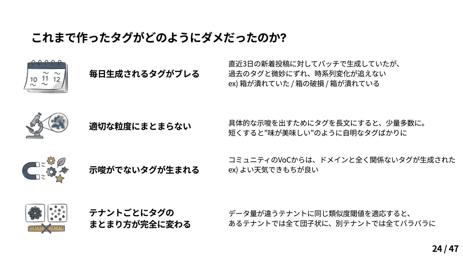 毎日生成されるタグがブレる 適切な粒度にまとまらない 示唆がでないタグが生まれる テナントごとにタグの まとまり方が完全に変わる 直近3日の新着投稿に対してバッチで生成していたが、 過去のタグと微妙にずれ、時系列変化が追えない ex) 箱が潰れていた /