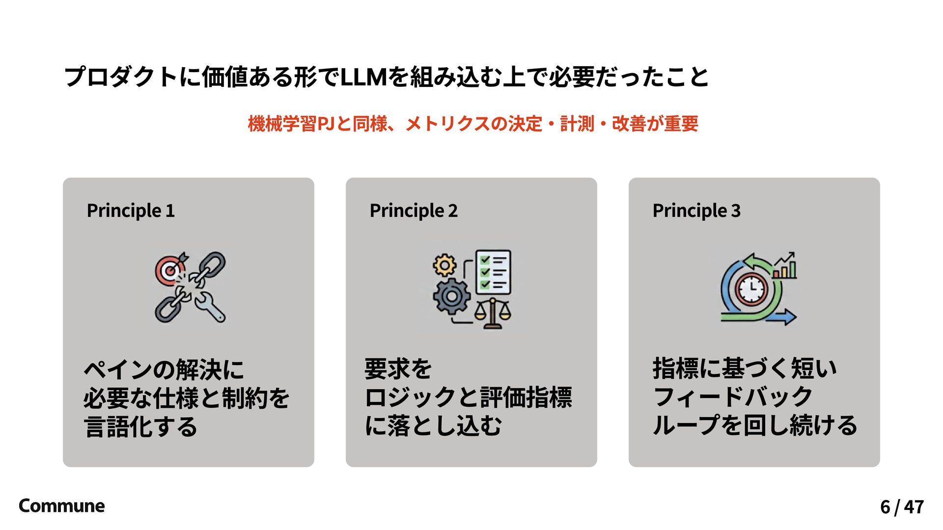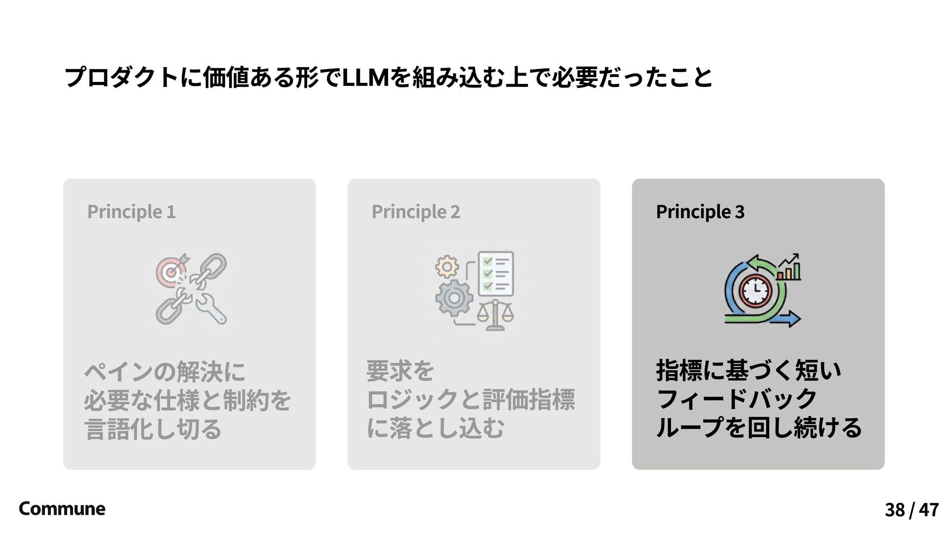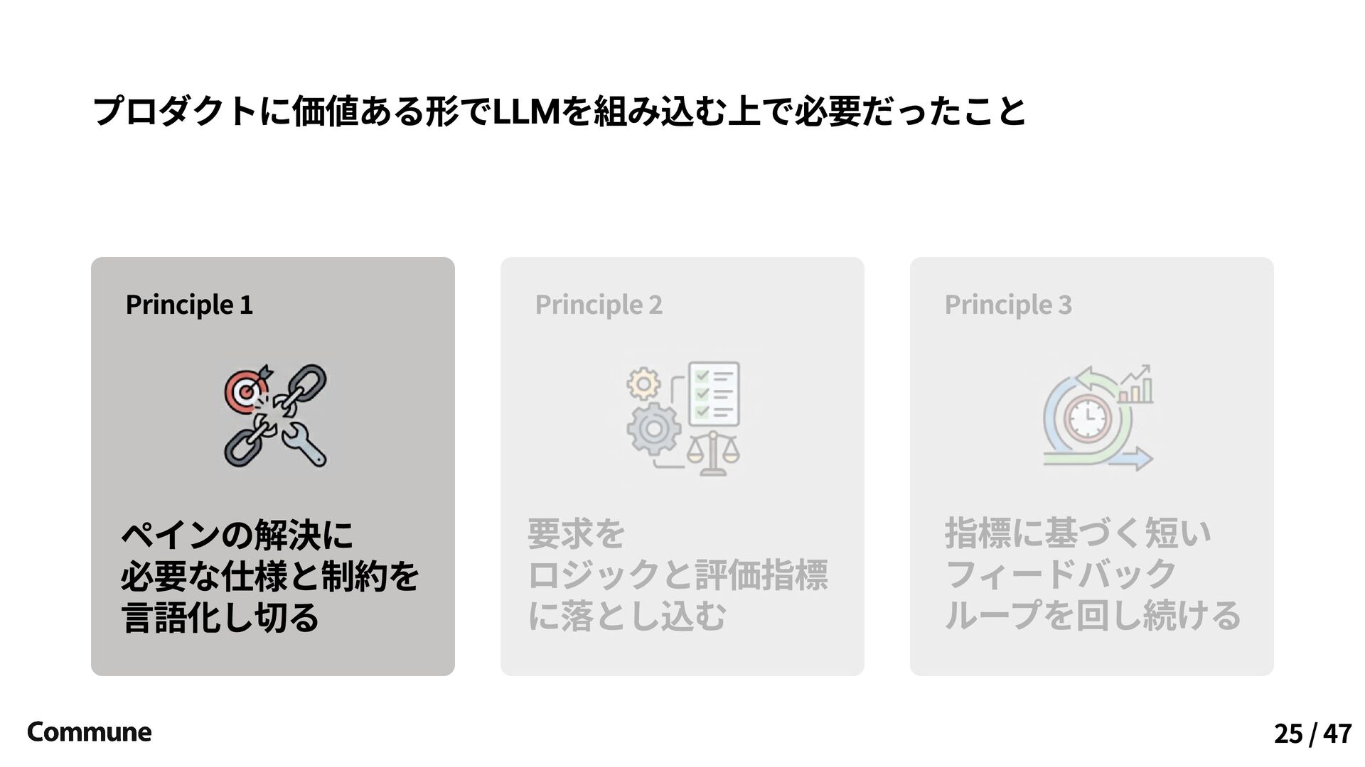 プロダクトに価値ある形でLLMを組み込む上で必要だったこと Principle 1 ペインの解決に 必要な仕様と制約を 言語化し切る Principle 2 要求を ロジックと評価指標