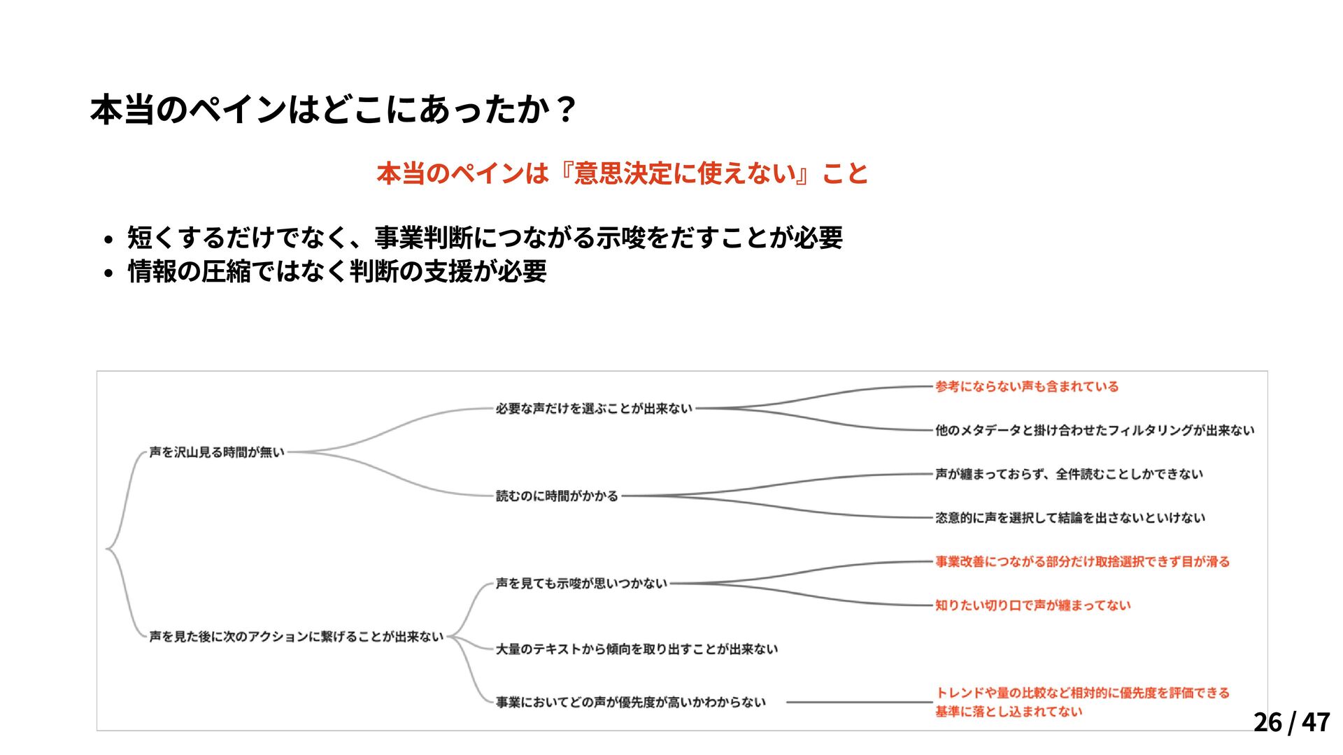 本当のペインはどこにあったか? 短くするだけでなく、事業判断につながる示唆をだすことが必要 情報の圧縮ではなく判断の支援が必要 本当のペインは『意思決定に使えない』こと 26 / 47
