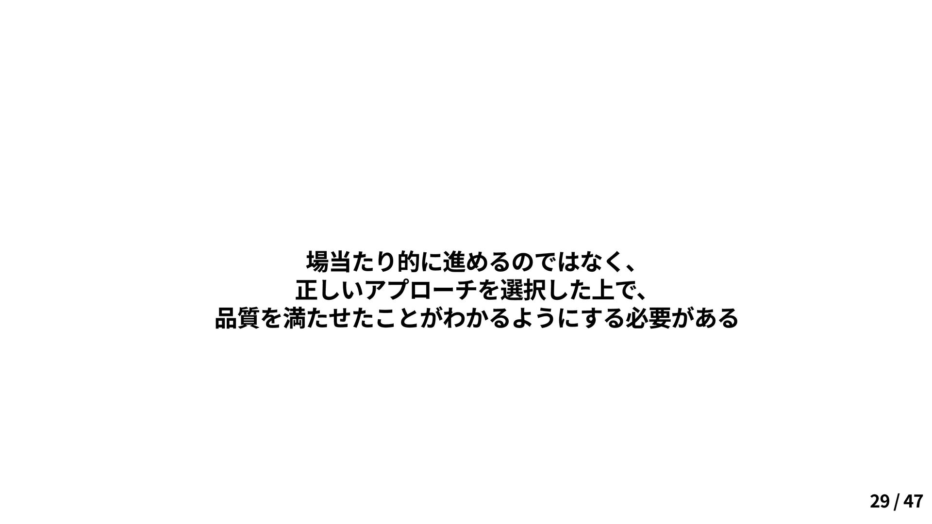場当たり的に進めるのではなく、 正しいアプローチを選択した上で、 品質を満たせたことがわかるようにする必要がある 29 / 47
