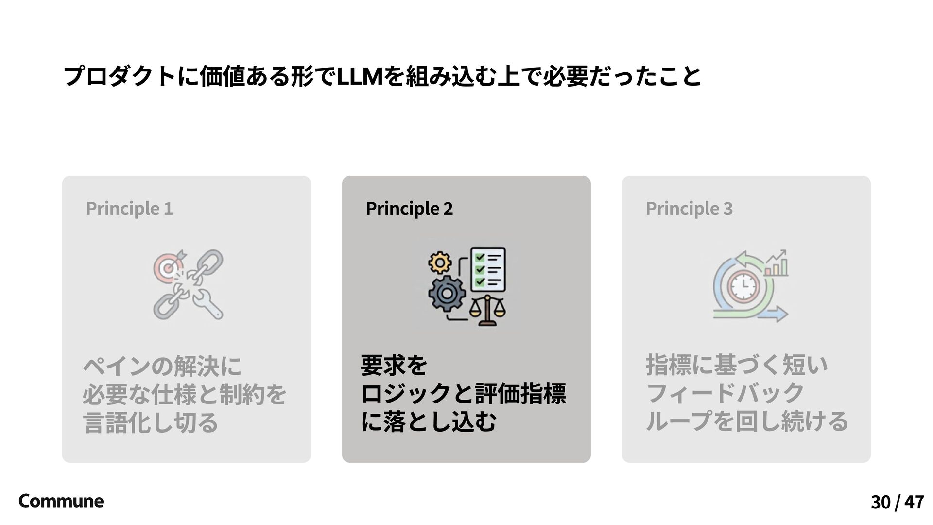 プロダクトに価値ある形でLLMを組み込む上で必要だったこと Principle 1 ペインの解決に 必要な仕様と制約を 言語化する Principle 2 要求を ロジックと評価指標