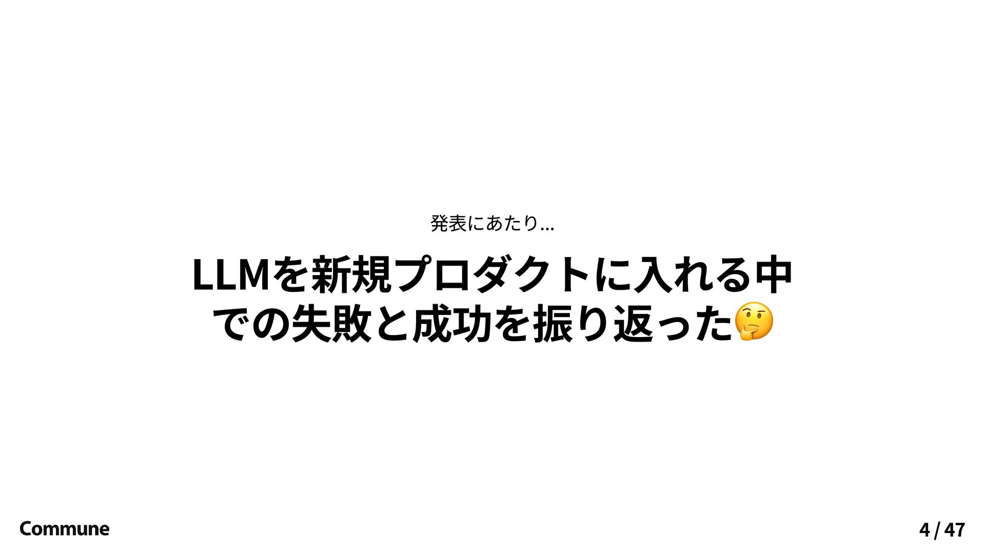 発表にあたり... LLMを新規プロダクトに入れる中 での失敗と成功を振り返った 4 / 47