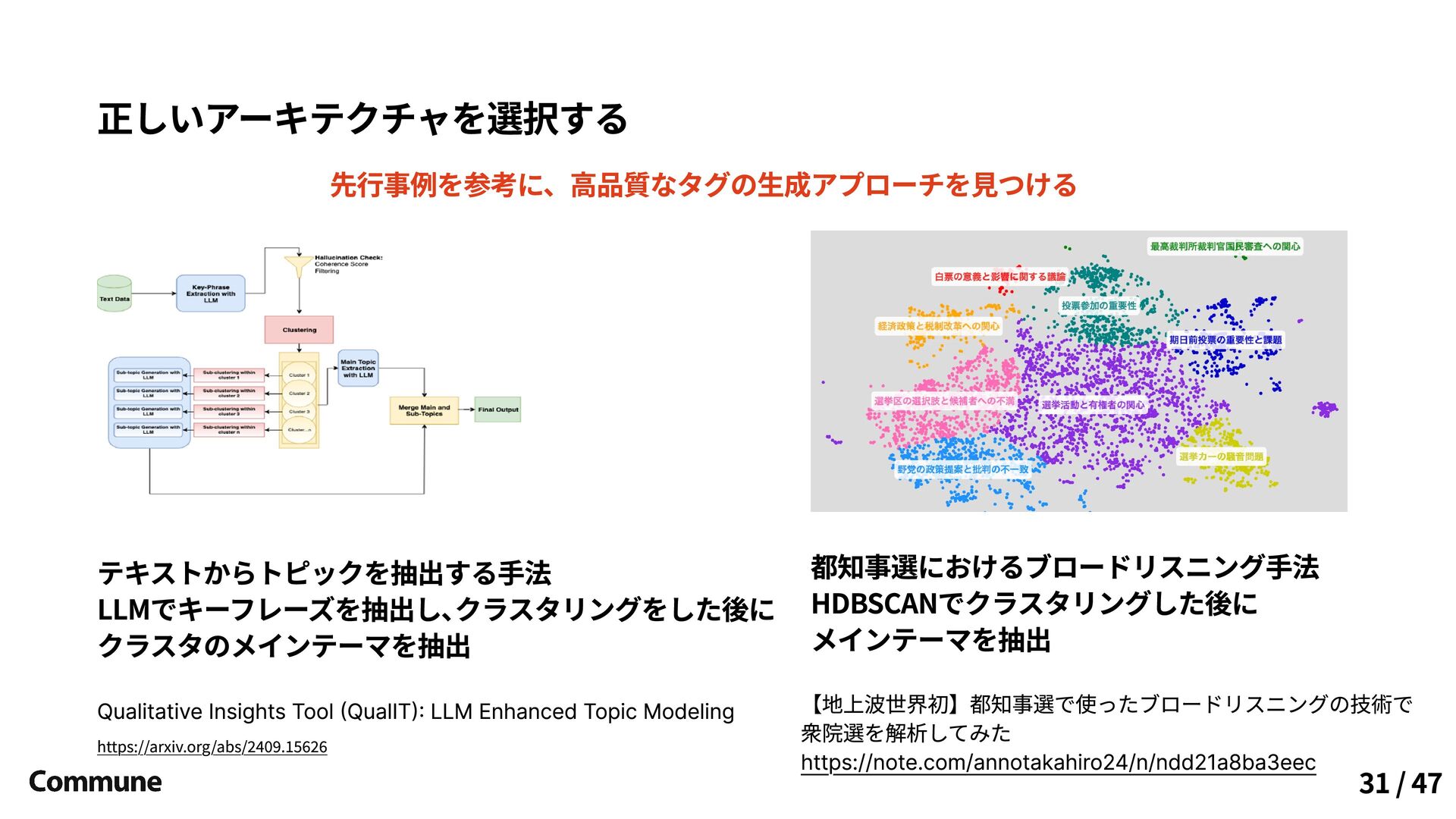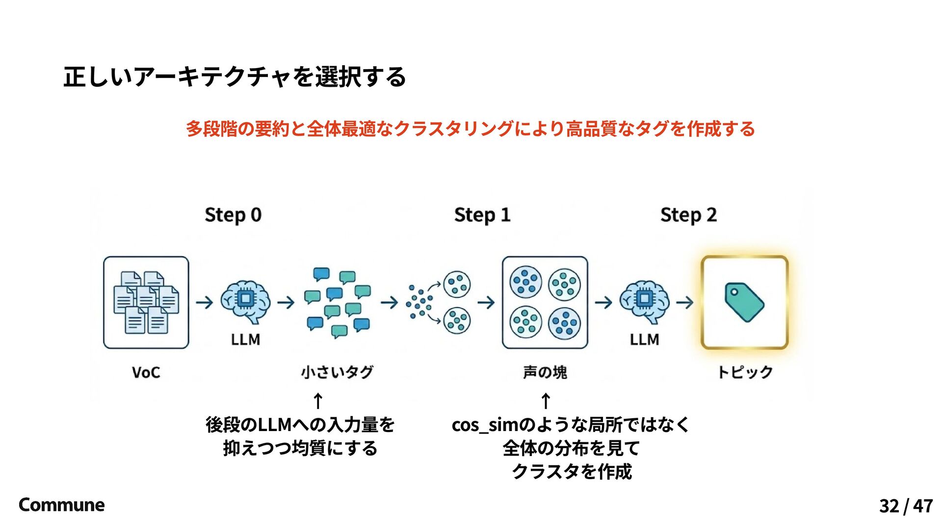 正しいアーキテクチャを選択する 多段階の要約と全体最適なクラスタリングにより高品質なタグを作成する 32 / 47 ↑ 後段のLLMへの入力量を 抑えつつ均質にする ↑ cos_simのような局所ではなく