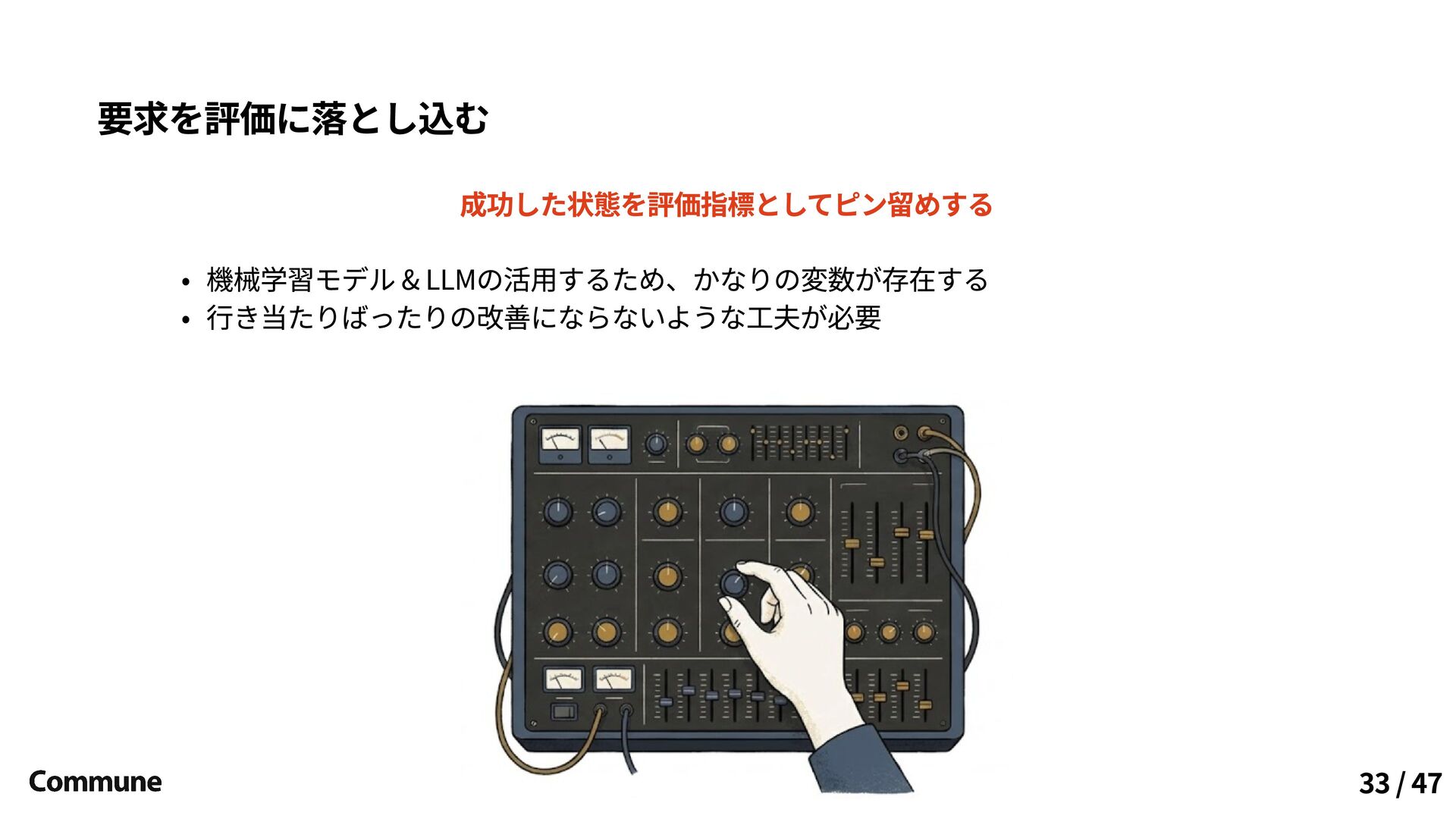 要求を評価に落とし込む 成功した状態を評価指標としてピン留めする 33 / 47 機械学習モデル & LLMの活用するため、かなりの変数が存在する 行き当たりばったりの改善にならないような工夫が必要