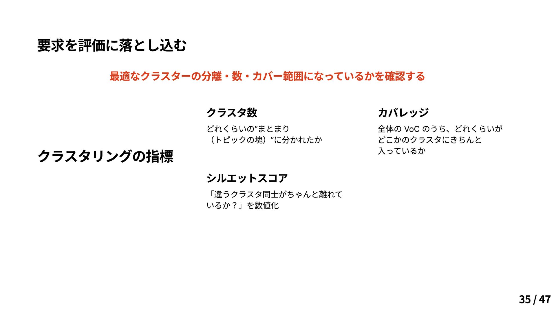 のうち、どれくらいが どこかのクラスタにきちんと 入っているか 要求を評価に落とし込む 最適なクラスターの分離・数・カバー範囲になっているかを確認する 35 / 47