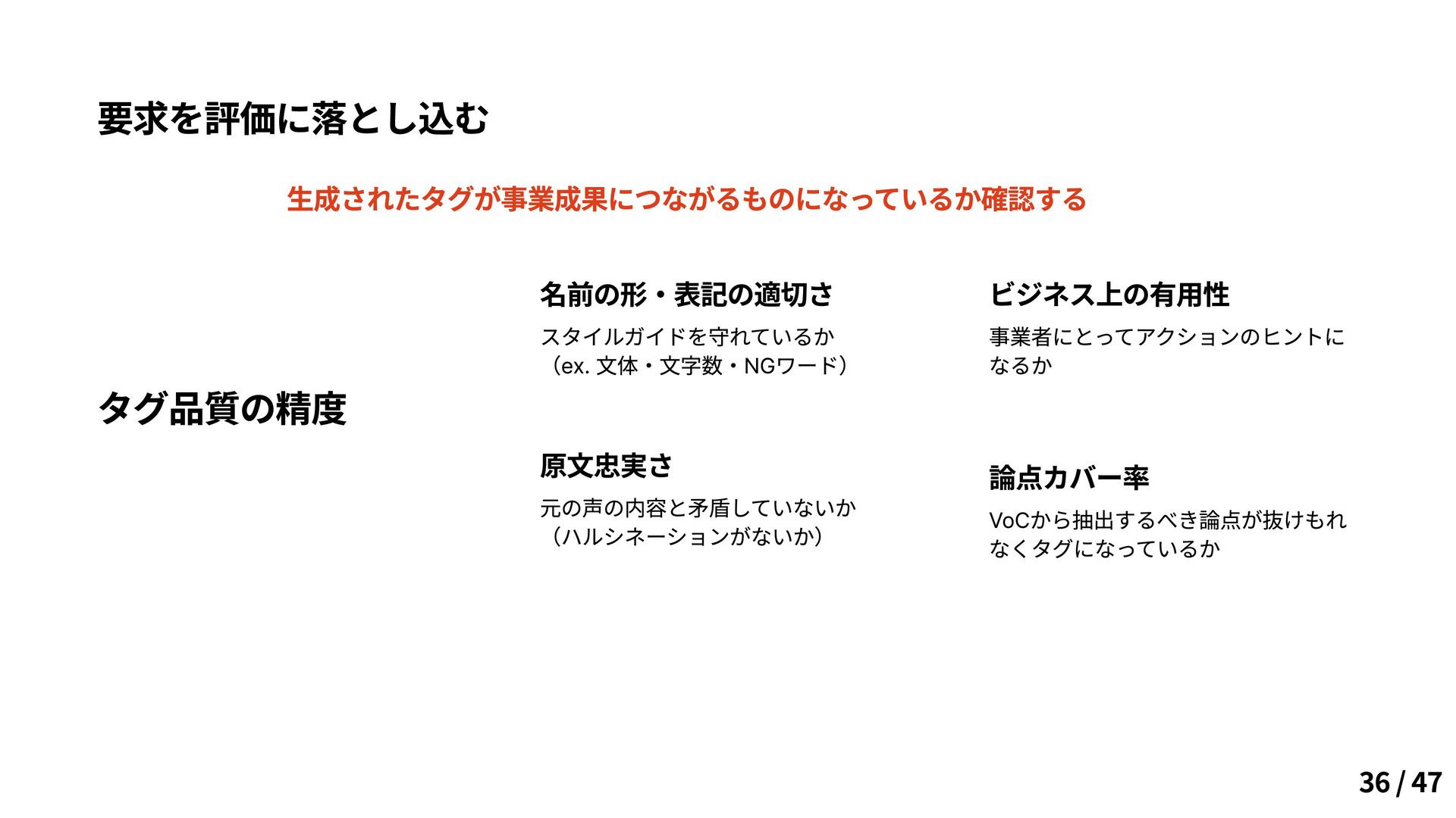 なるか 論点カバー率 VoCから抽出するべき論点が抜けもれ なくタグになっているか 要求を評価に落とし込む 生成されたタグが事業成果につながるものになっているか確認する 36 / 47